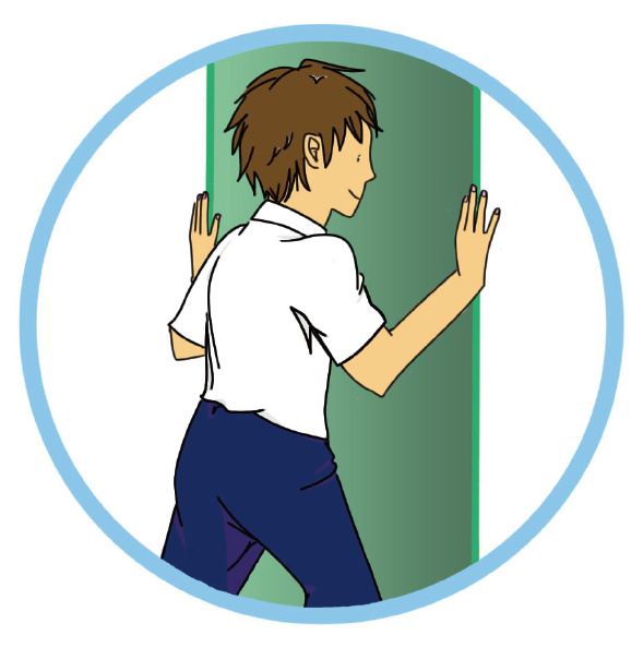 雙手按住門框,向前踏出一步,順勢向前挺胸