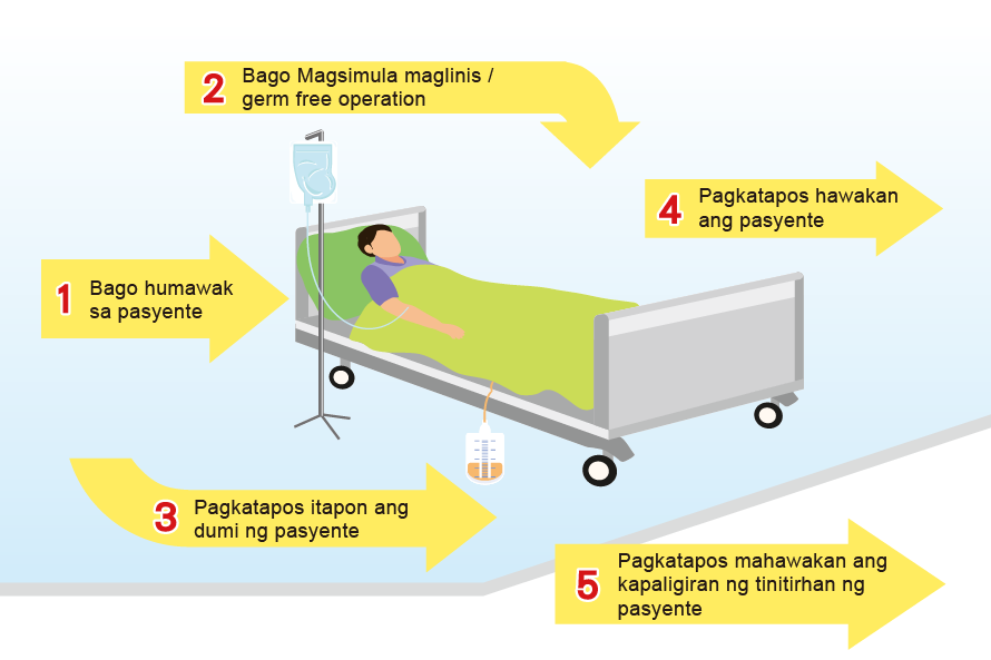 Pagkatapos mahawakan ang mga kagamitan o kasangkapan sa paligid ng pasyente, maghugas muna ng kamay bago umalis kahit na hindi nahawakan ang pasyente.