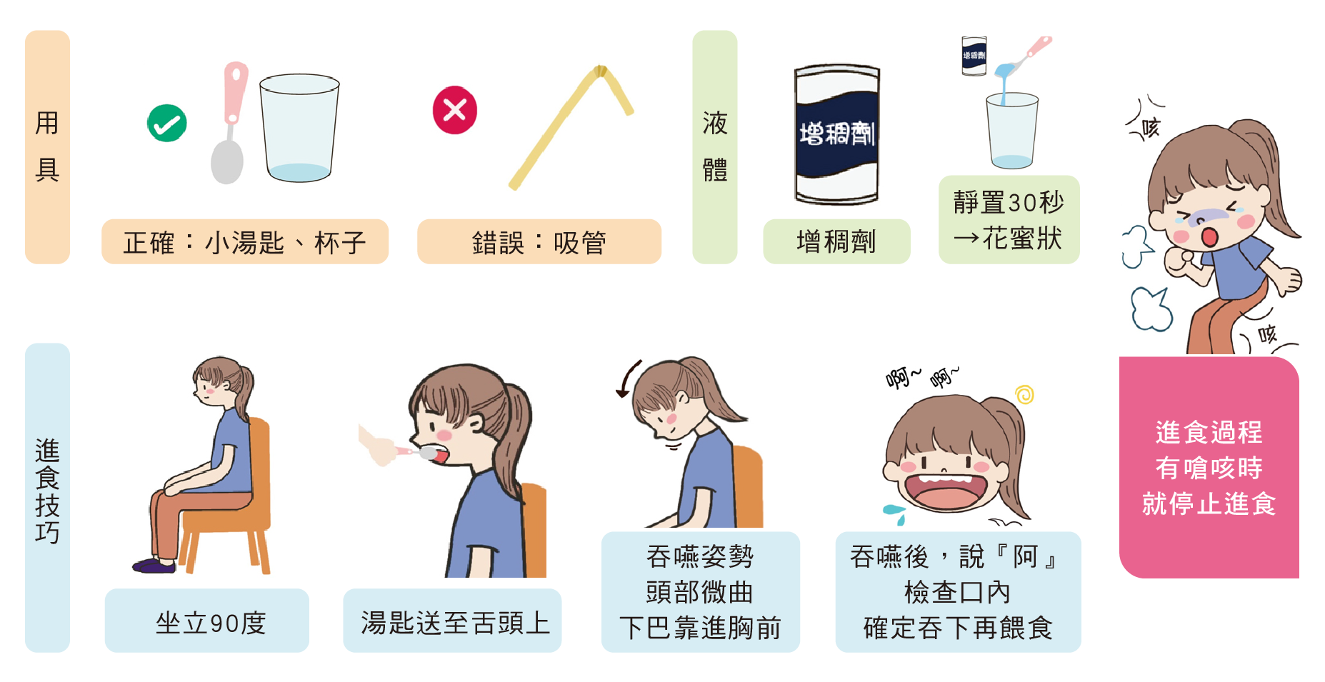 - 意識清楚合併吞嚥障礙者,應採軟質飲食,並遵守如下之進食原則: