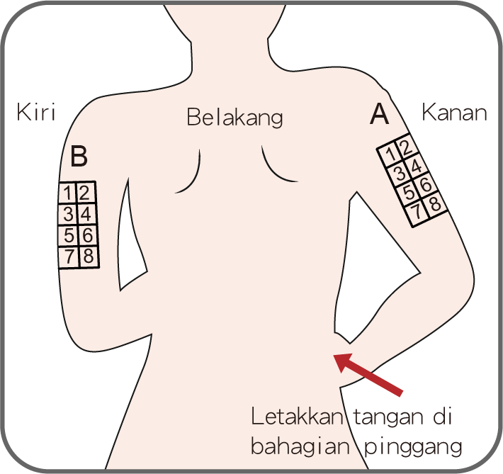 - Bahagikan posisi suntikan (eg. lengan kanan huruf A) kepada 8 bagian, sasaran suntikan perlu dipisahkan dengan jarak sebanyak 1 jari. Berikan suntikan secara bergiliran, selepas 8 bagian daripada salah satu posisi suntikan telah habis disuntik, barulah menukar posisi suntikan (eg. Dari A-kanan ke B-kiri ) kepada posisi yang lain.