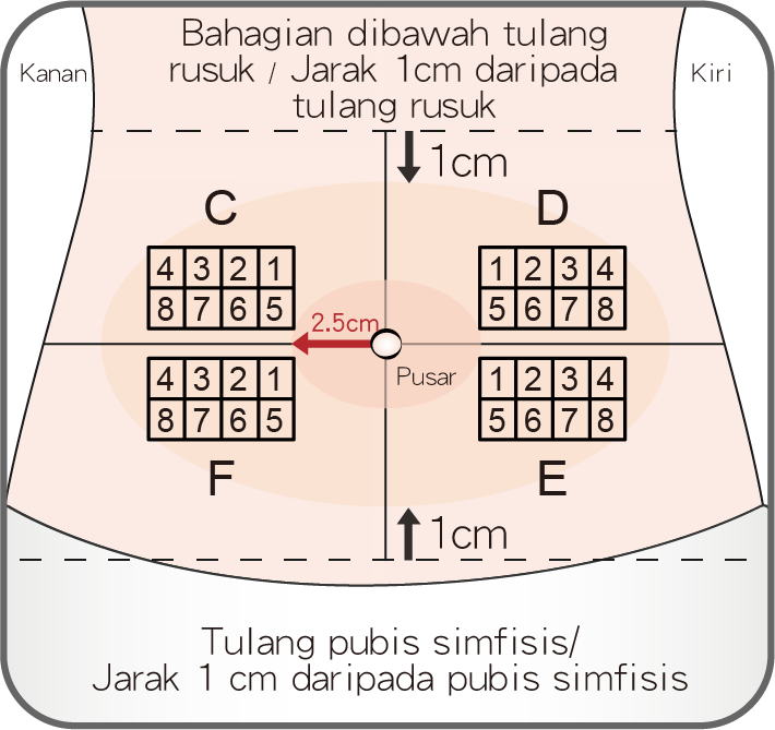 - Perut:Pesakit menutup pusar dengan salah satu tangan membuat bentuk tumbukan, menempatkan tapak tangan yang tersedia disisi tumbukan untuk membuat ukuran batasan sasaran suntikan, Suntikan perlu diberikan dalam jarak tapak tangan.