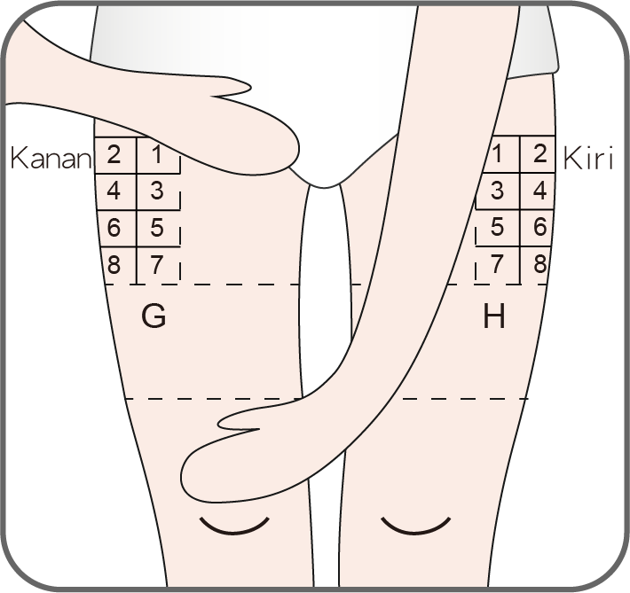 - Untuk individu yang memberi suntikan sendiri, bagian perut (C~F) dan paha (G~H) diutamakan.