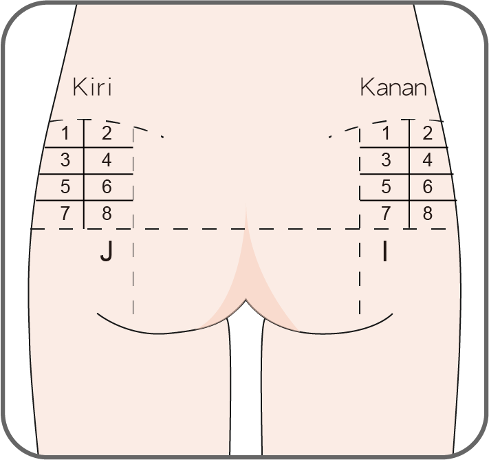 - Bokong:Satu sisi pinggul dibagi menjadi empat bagian, Beri suntikan di bahagian luar 1/4 bokong.