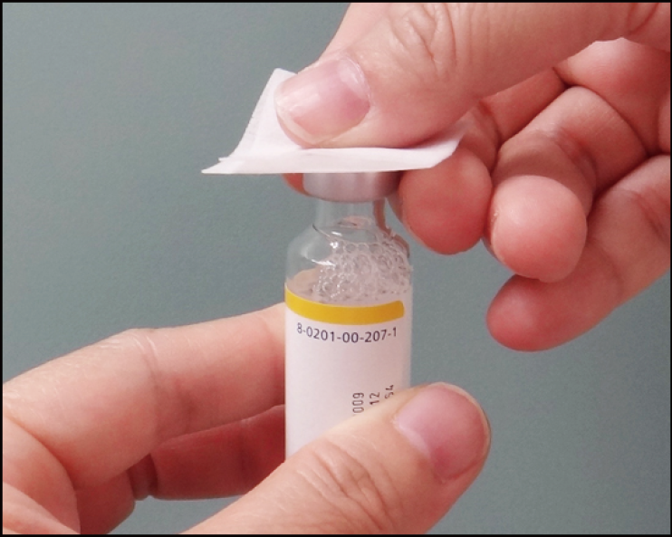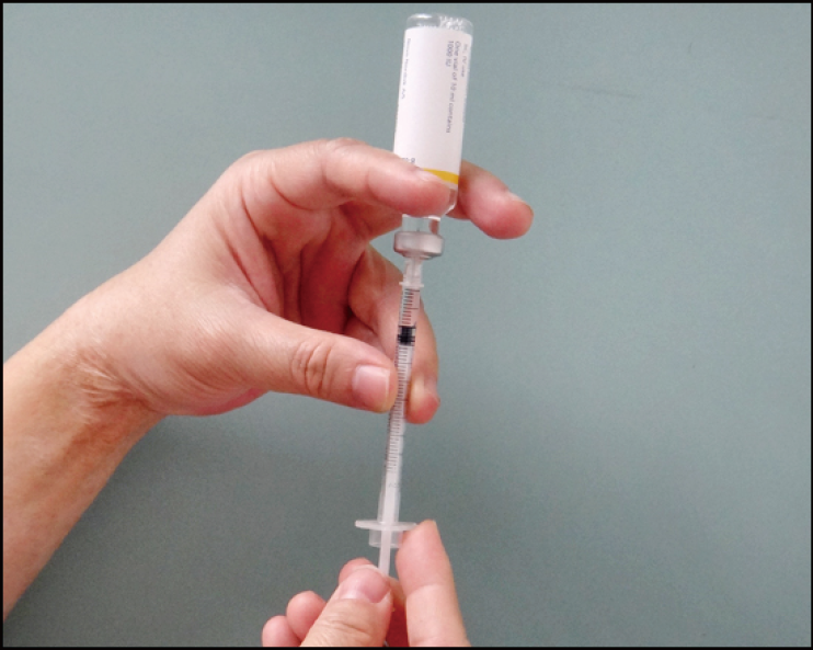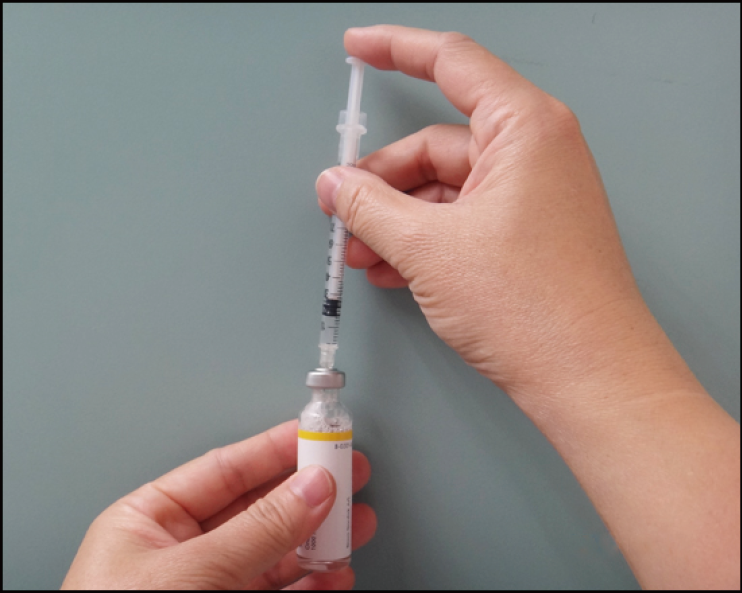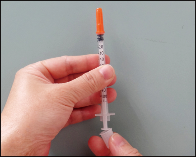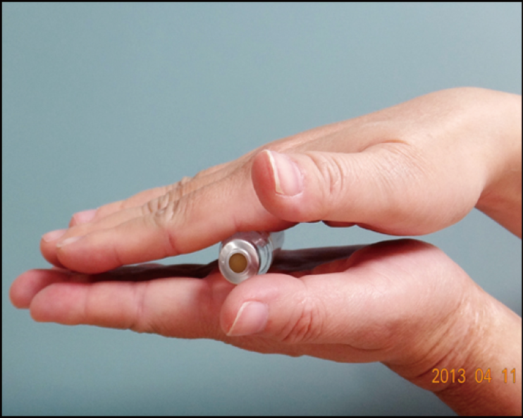 - ※若是抽取混濁型胰島素,先將藥品平放掌中,雙手來回輕搓至少20次使藥劑均勻混合後,再接續進行第2個步驟。