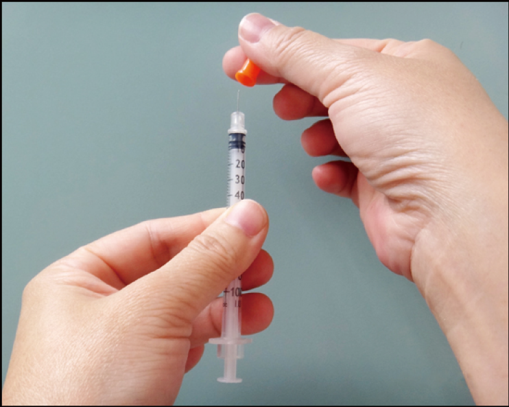 - 再次檢查劑量無誤時,請先將針蓋蓋好針頭,將針筒平放,準備注射。