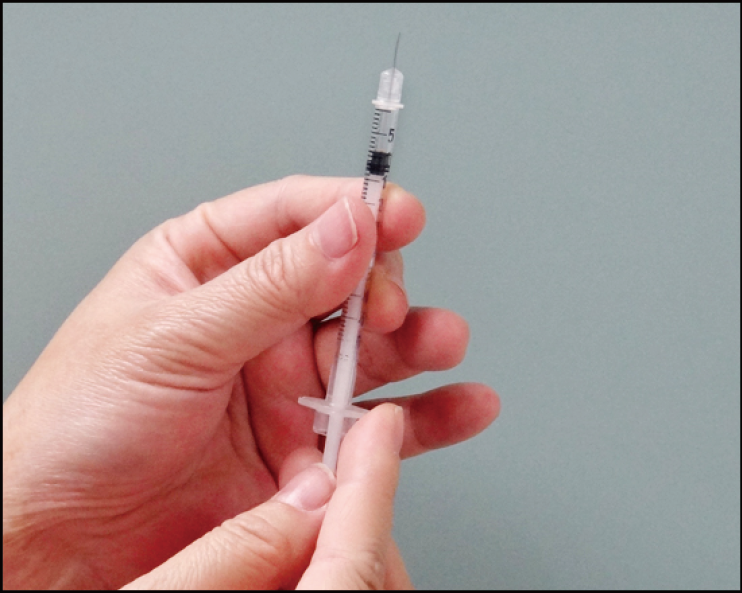 - 繼續維持捏起的部位,持針筒的手按下推桿,慢慢將藥物全部注入。