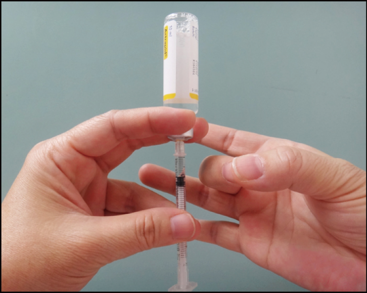- 藥瓶倒過來拿好,將針筒內的白色拉柄往下輕拉,抽取所需的劑量。