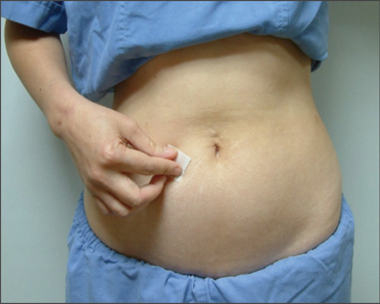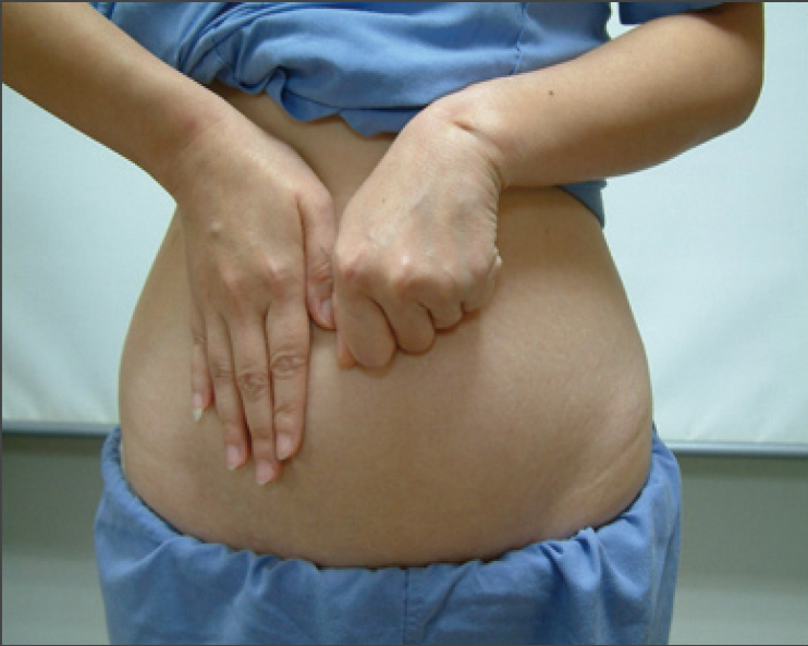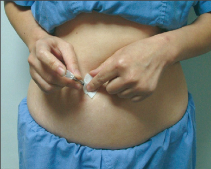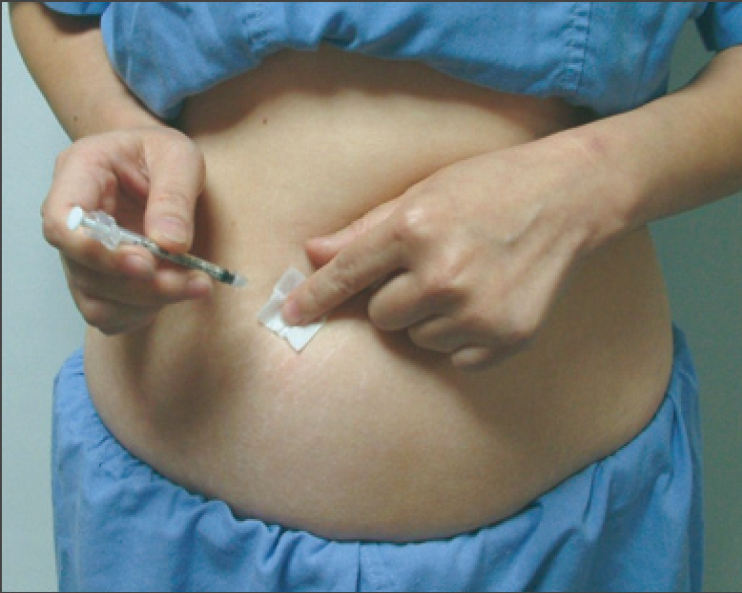 - 病人一手握拳蓋住肚臍,另一手掌置於拳頭旁,注射在手掌寬的距離內。