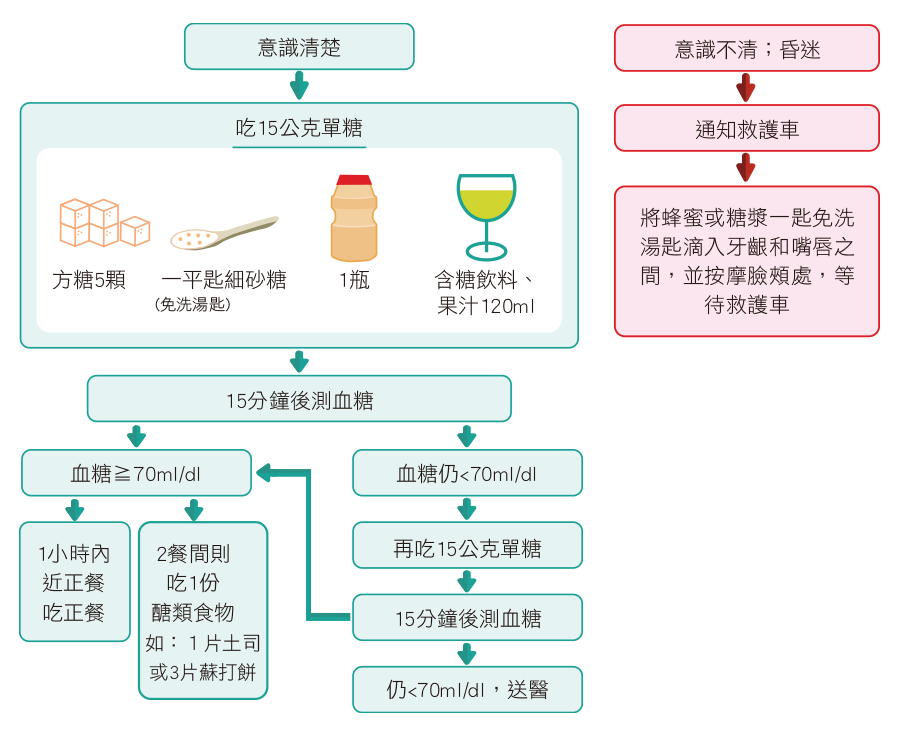 - 注射胰島素或口服降血糖藥時劑量要準確,且在使用後按時進食。