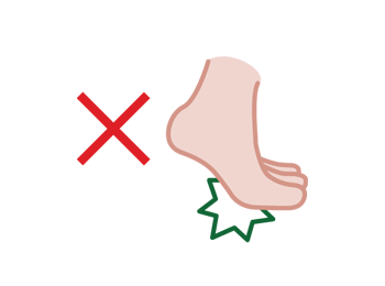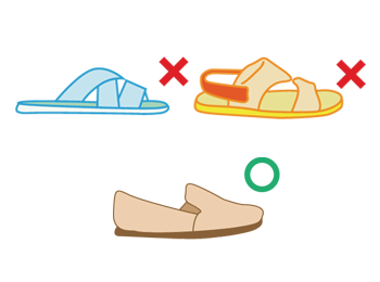 - 不穿趾頭沒有包覆的鞋,如涼鞋、拖鞋、日式夾腳鞋等,可避免足底及趾縫受傷。