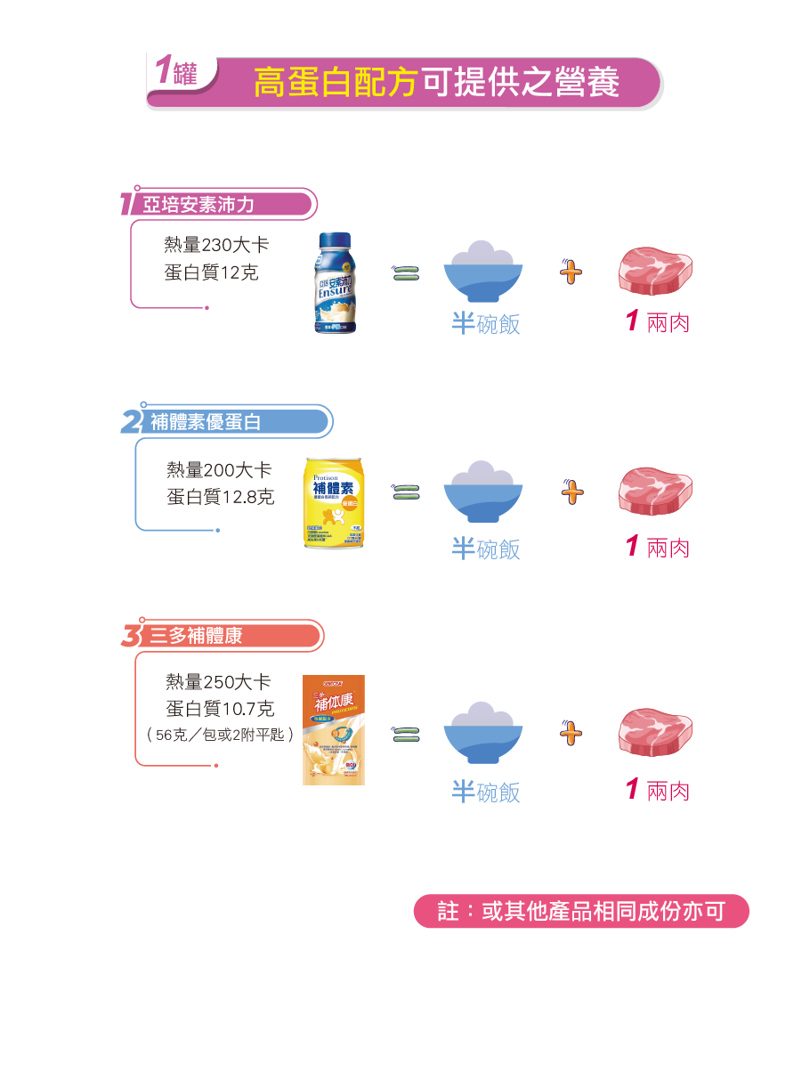 - 可選擇補充之營養品,建議可 擇一 補充腫瘤配方或高蛋白配方。