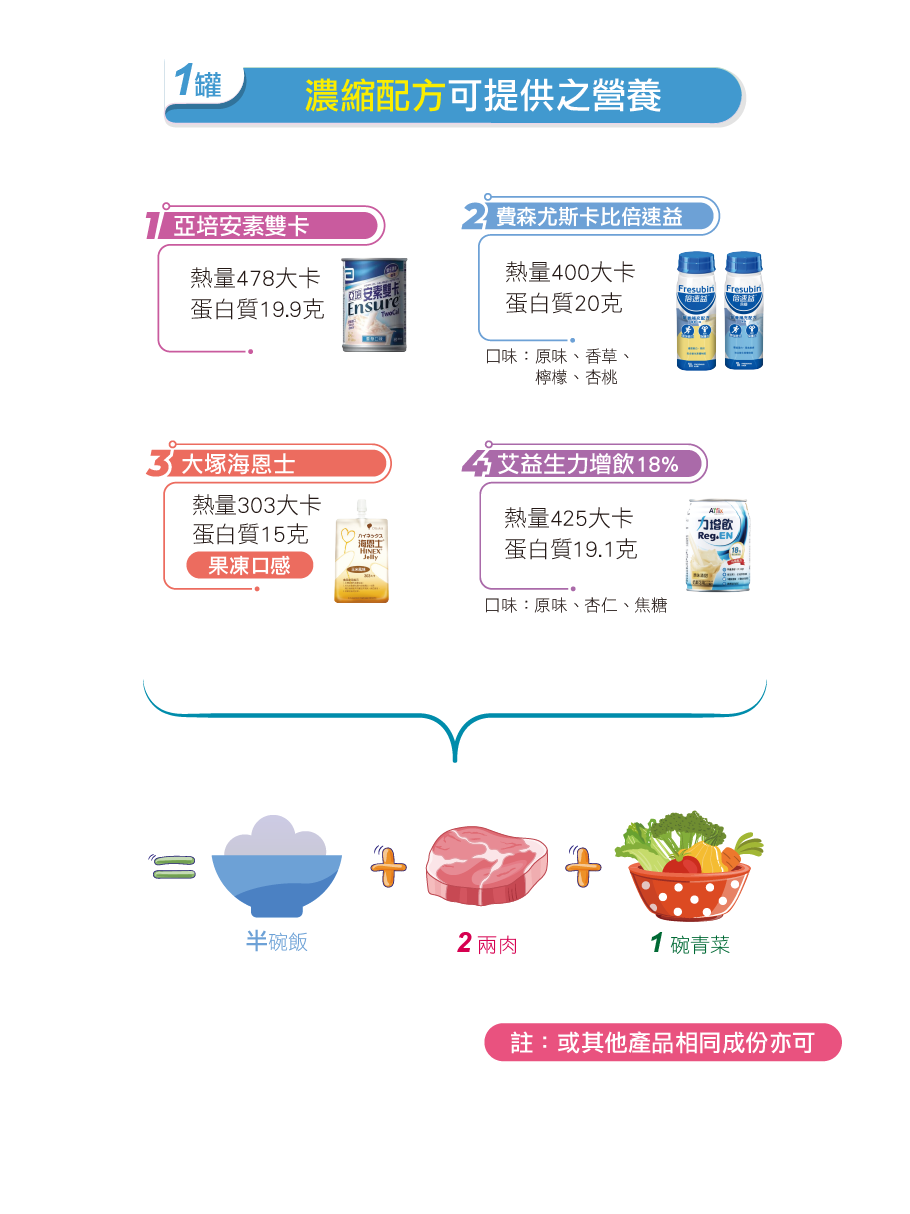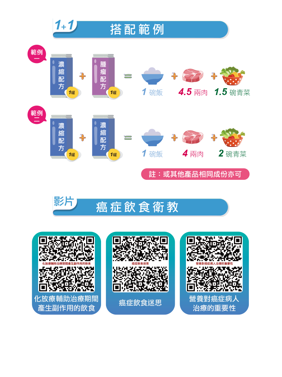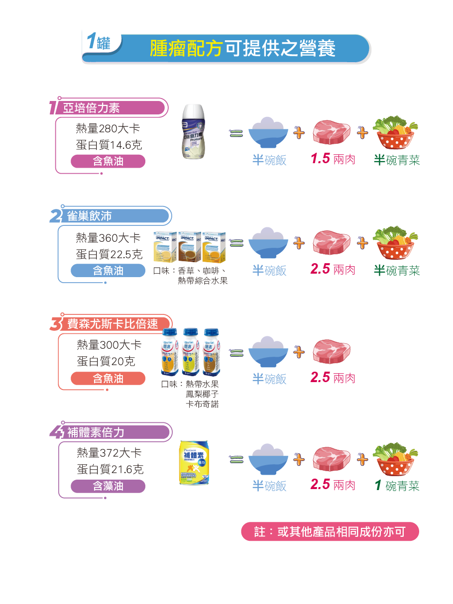 - 可選擇補充之營養品,建議可 搭配 補充腫瘤配方及濃縮配方。