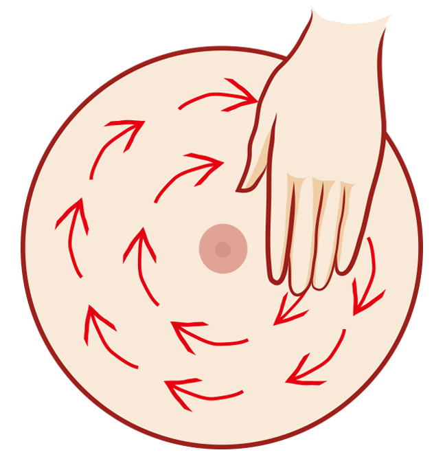 - 左手上提至頭部後側,用右手檢查左乳,以手指之指腹輕壓乳房,由乳頭開始環狀順時鐘方向檢查,逐漸向外(約三至四圈)至全部乳房檢查完整為止,用同樣方法檢查右邊乳房。(圖二及圖三)
