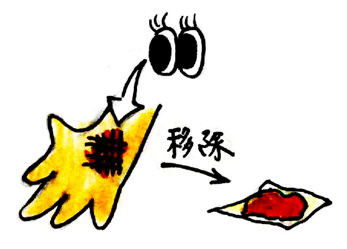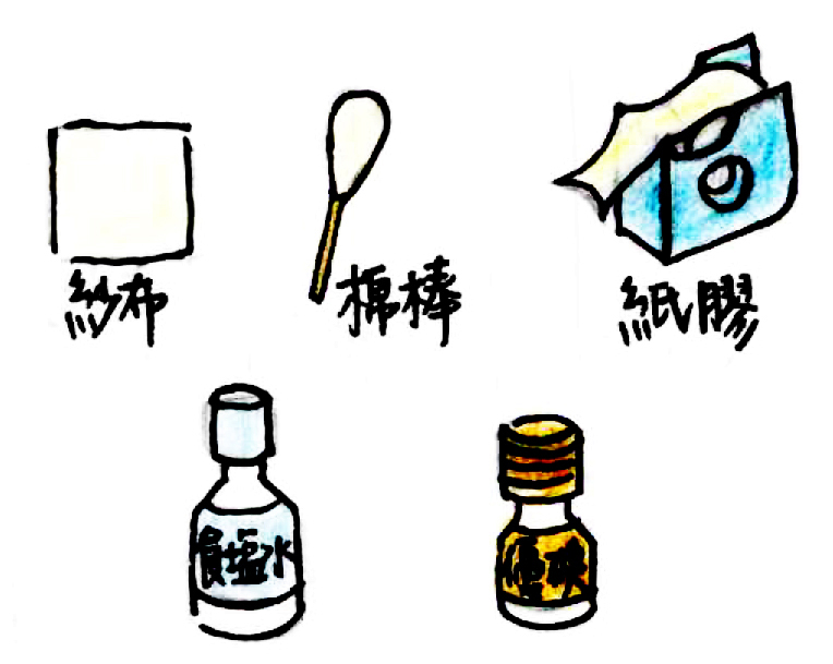 - 水溶性優碘消毒→30秒後→生理食鹽水擦拭→蓋紗布。