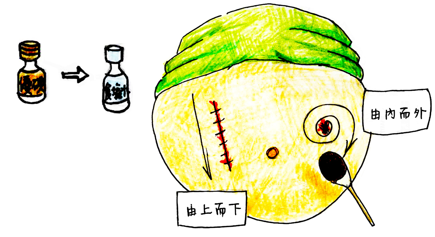- 消毒範圍至少大於傷口5公分。,避免來回擦拭。
