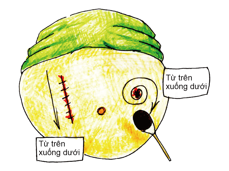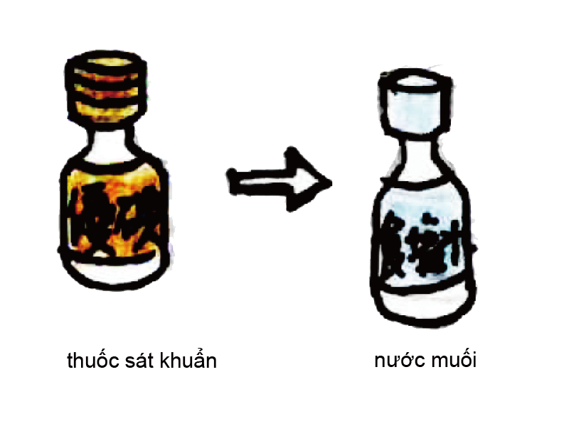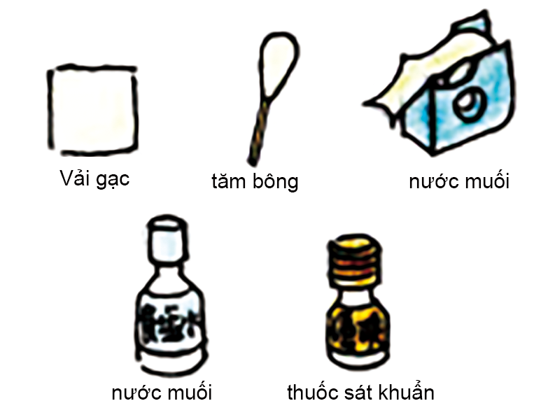 - (1)Khử trùng bằng dung dịch sát khuẩn hòa tan trong nước → sau 30 giây → lau chùi bằng nước muối sinh lý → đắp vải xô
