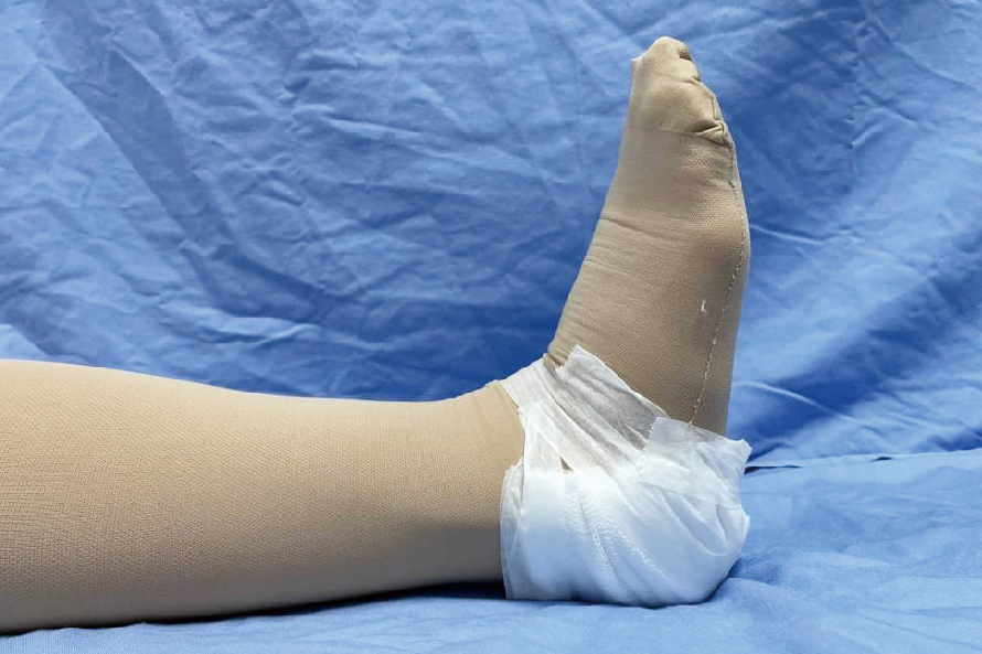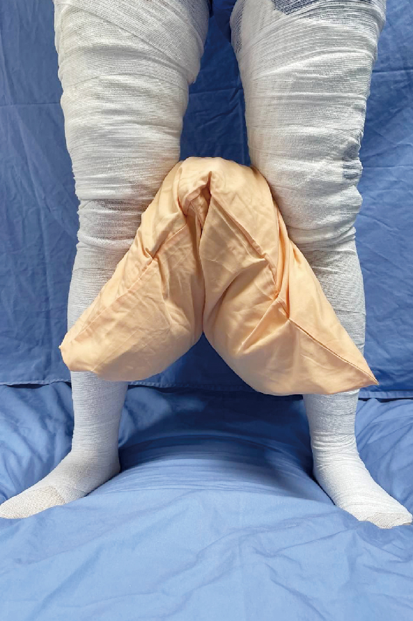 擺位:保持完全伸直,大腿內側或會陰部有燒傷時,股關節需外展15到30度(圖21)。