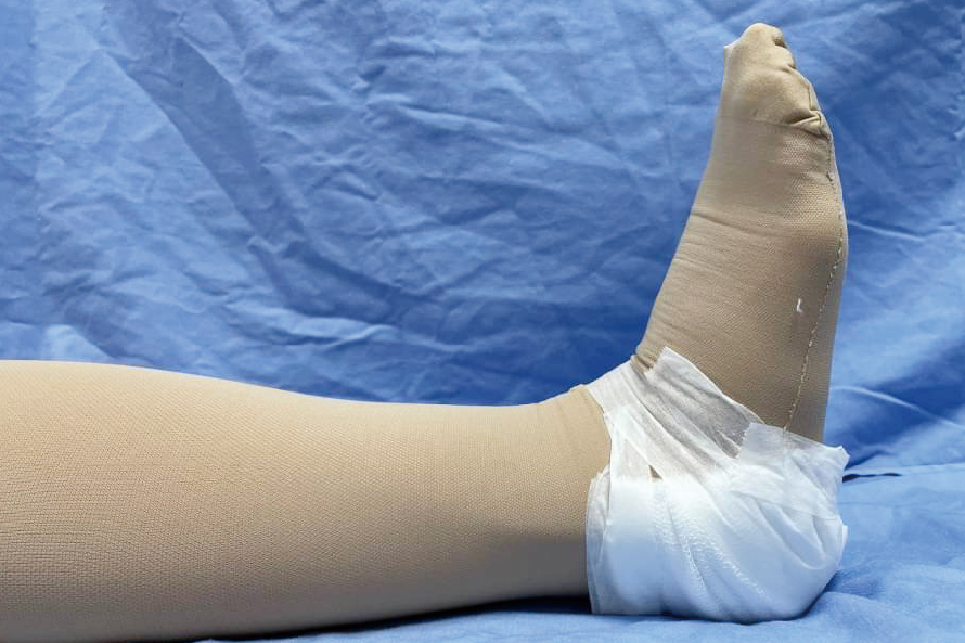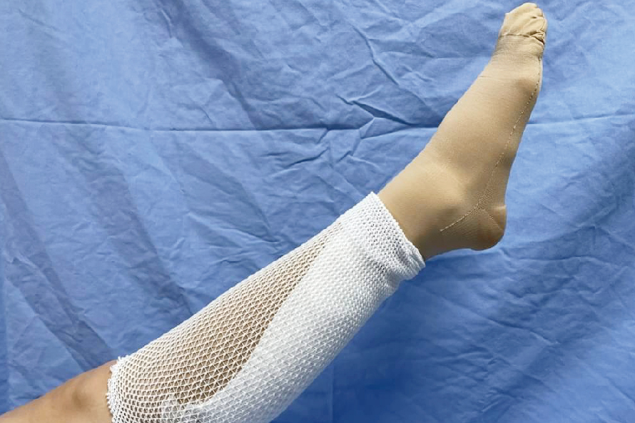 運動:膝關節後側或小腿有傷口,平躺時,做伸展的動作(圖23)。膝關節前側有傷口,平躺時,膝關節做彎曲,往身體方向的動作 (圖24)。俯臥時,小腿與足做往臀部方向的動作(圖25)。