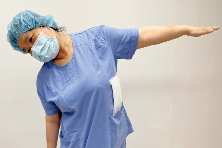 運動:頸部有傷口時,頭部往後仰,再扶正,不斷重複同樣的動作(圖2)。頸部右側有傷口時,做偏左再正中的運動,即轉頭向左側的動作。反之則相反(圖3)