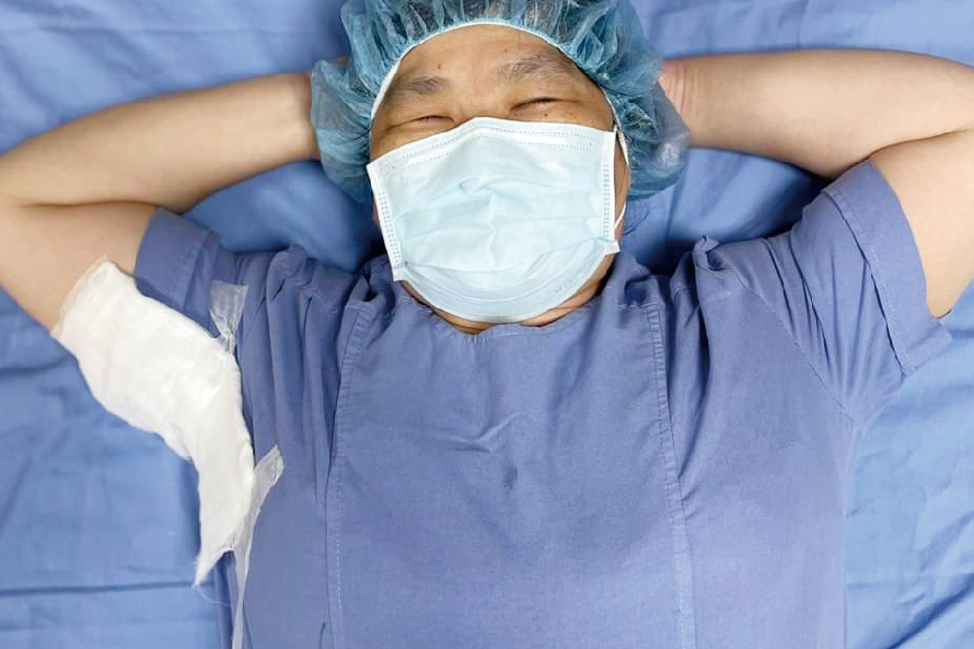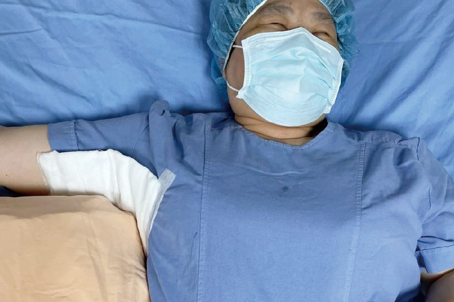 運動:腋下有傷口時,應多做外展的運動,平躺時,把手放在頭下,使腋下成90度的姿勢(圖5)。胸、肩部有傷口時,做水平外展的動作(圖6)。