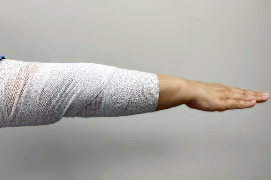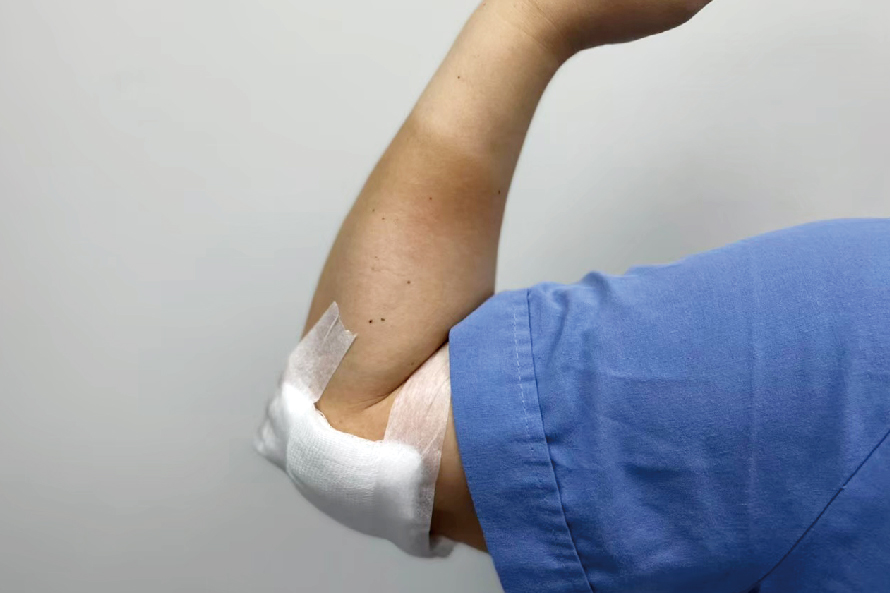 擺位:腋下有燙傷時,肩膀保持在90度外展及外旋的姿勢(圖4)。