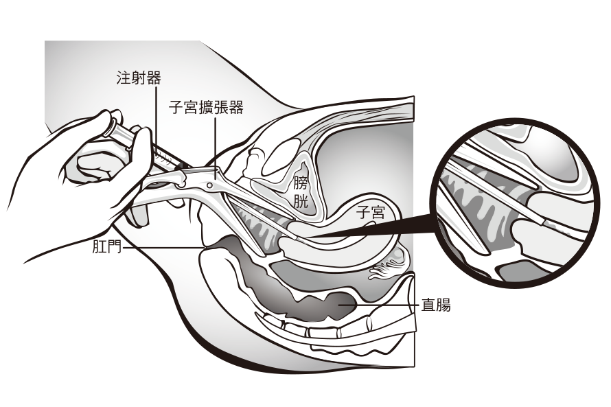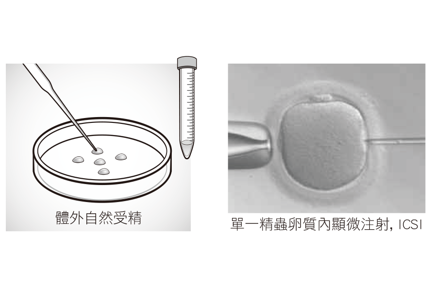 配合月經週期,使用排卵藥物刺激濾泡成長,藉超音波掃瞄濾泡大小及抽血測量荷爾蒙濃度,確定卵泡成熟後,再以超音波取卵(圖一),將卵與精子置於培養皿中進行體外自然受精或行單一精蟲卵質內顯微注射(圖二),當受精卵發育成4~8個細胞的胚胎或囊胚後,再由陰道放入子宮內(圖三),使之發育著床。