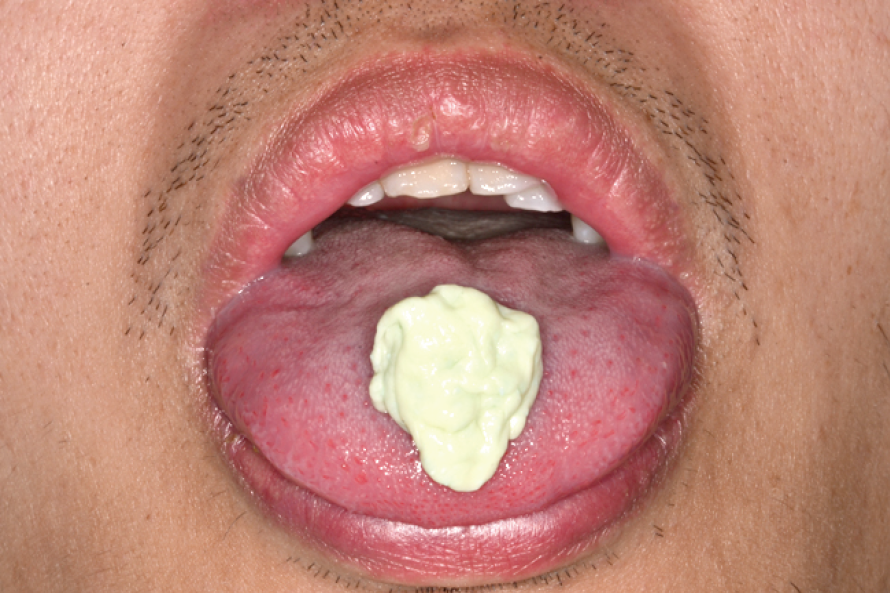 - 用後牙咀嚼口香糖(建議無糖口香糖),在用舌頭將咀嚼過的口香糖滾動至舌尖處(圖一)。