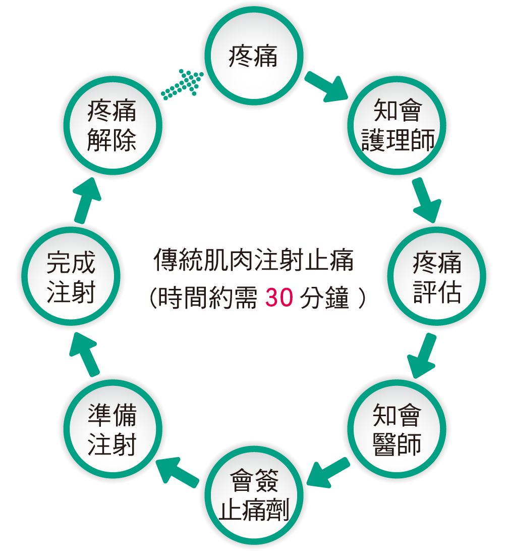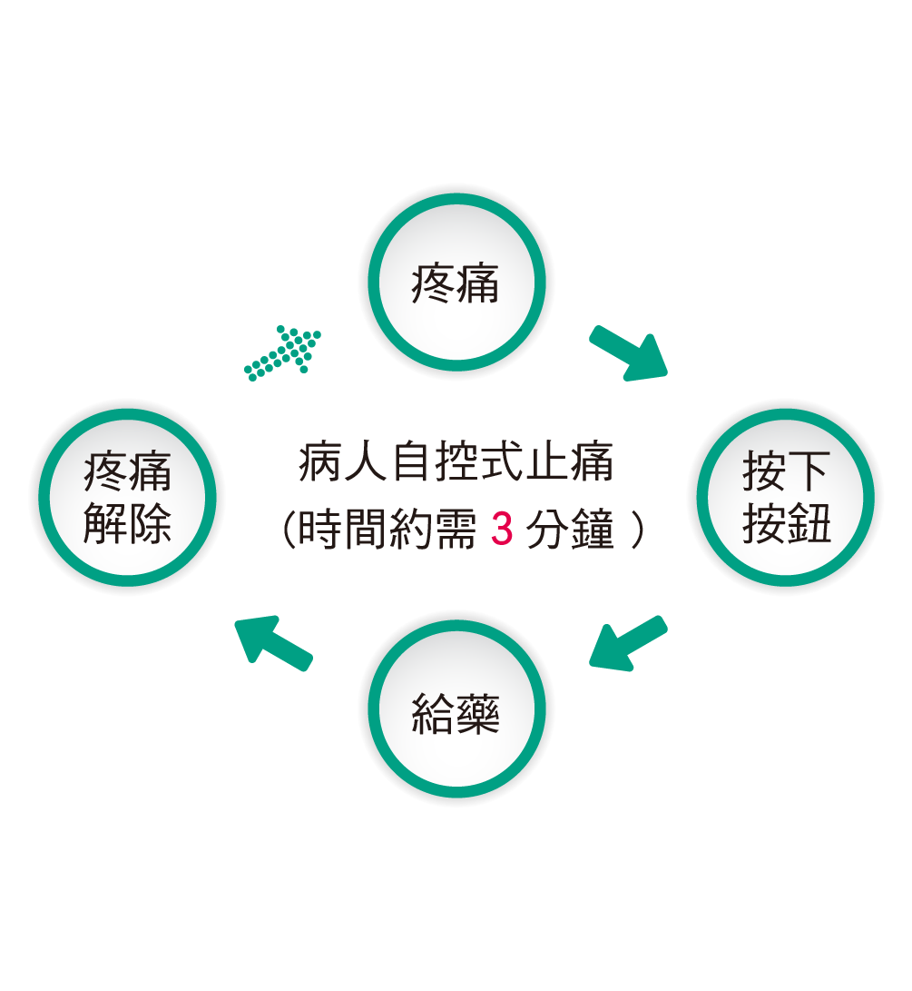 - 比傳統肌肉注射止痛藥更快達到止痛效果(如下圖:病人自控式止痛和傳統肌肉注射止痛過程比較 )。