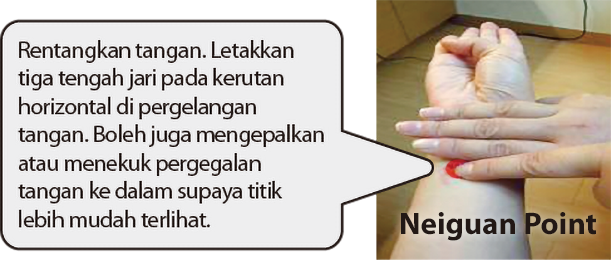 Titik Neiguan: Antara tiga jari dan dua tendon di bawah garis horizontal pergelangan tangan. - Cara memijat:
