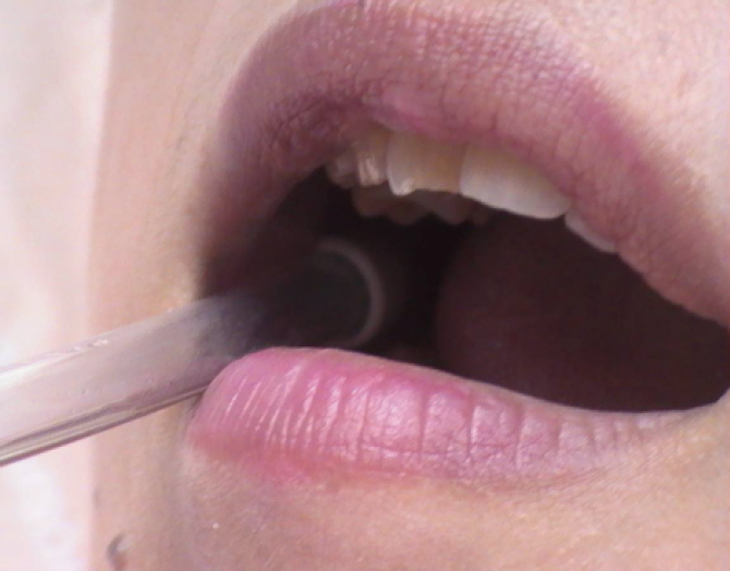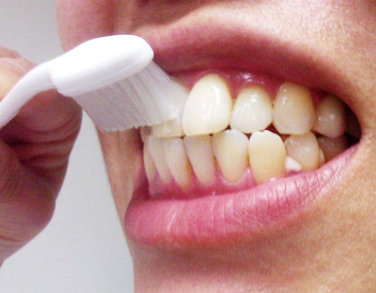 - Sử dụng bàn chải bọt biển hoặc bàn chải lông mềm dành cho trẻ em chấm vào dung dịch nước súc miệng hoặc nước trà xanh làm sạch răng và lưỡi cho bệnh nhân, bắt đầu từ trên xuống má trong bên phải, độ tiếp xúc giữa bàn chải và mặt răng là 45 độ, gồm lợi và 2 chiếc răng đánh đi đi về về 10 lần.