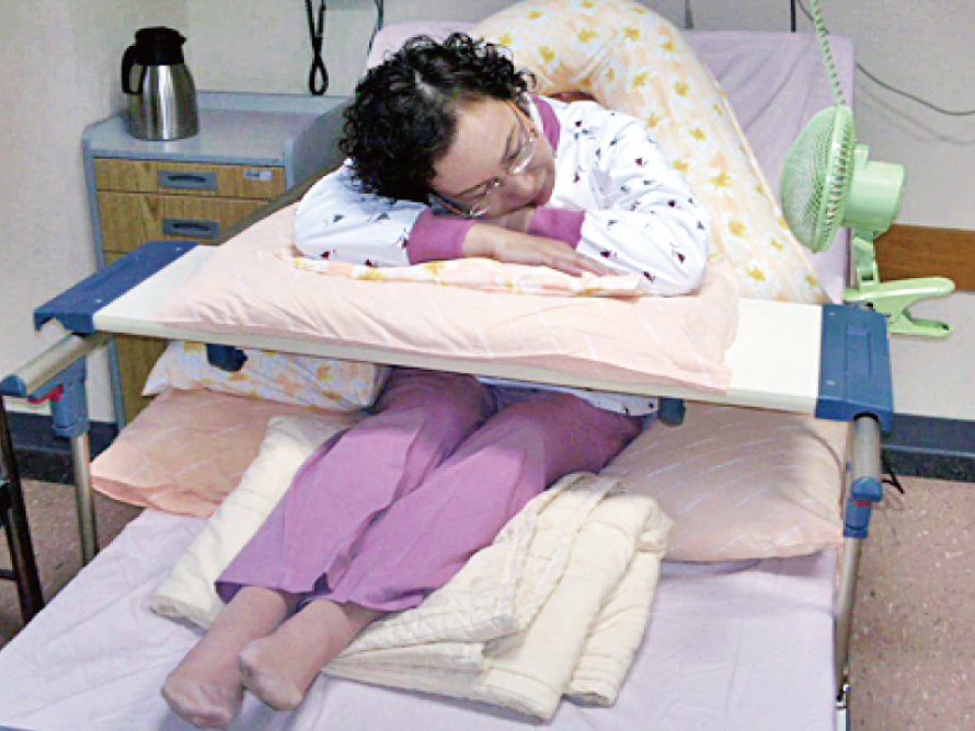 - Pertahankan posisi tidur yang nyaman: Miringkan bagian atas tempat tidur atau gunakan bantal untuk menopang kepala agar pasien berada dalam posisi setengah duduk atau posisi duduk sambil bersandar di meja tempat tidur yang diberi bantal. Ini akan membantu pasien bernapas lebih mudah.