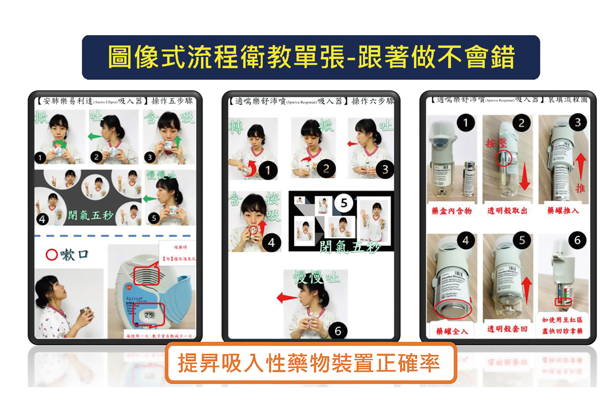 希望能夠提升病人吸入性藥物裝置的正確使用,改善病人日常生活品質,與日常活動性喘的症狀,以達最適切的照護。本院除了參加肺阻塞整合照護計畫外,也成立了品管圈,改善病人照護品質,改善病人的衛教流程與提昇效率。
