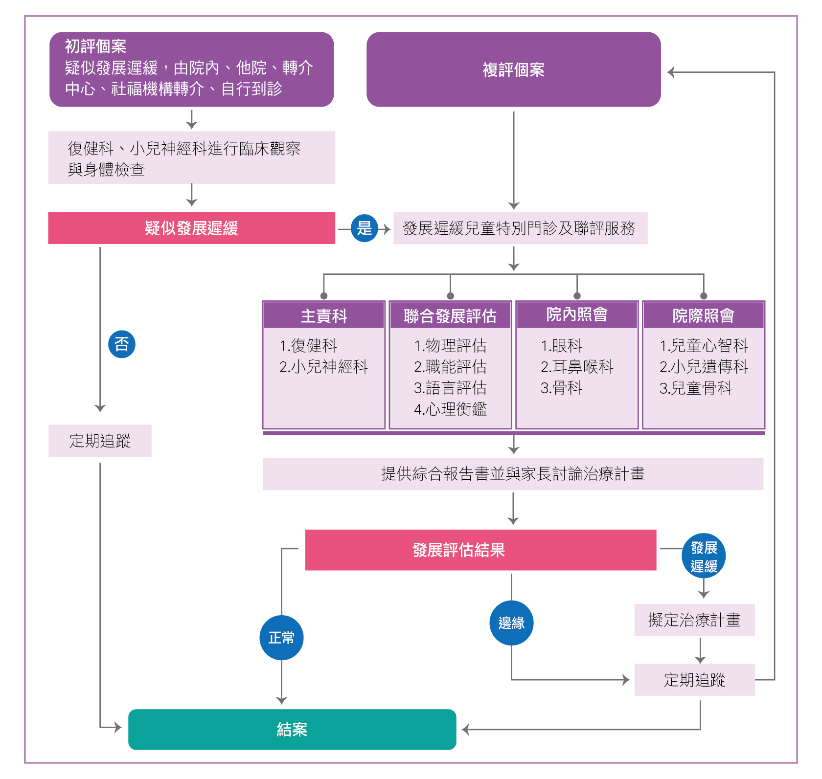 發展遲緩兒童醫療問題複雜,中心團隊結合小兒神經科、復健科、兒童心智科、物理治療師、職能治療師、語言治療師、臨床心理師、社工師、個案管理師等專業。不僅評估個案的發展狀況,也會一同評估孩童未來的醫療與早療需求,並轉介相關資源幫助孩童未來發展。