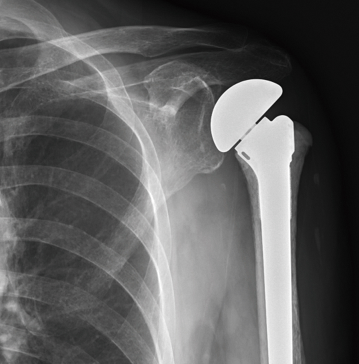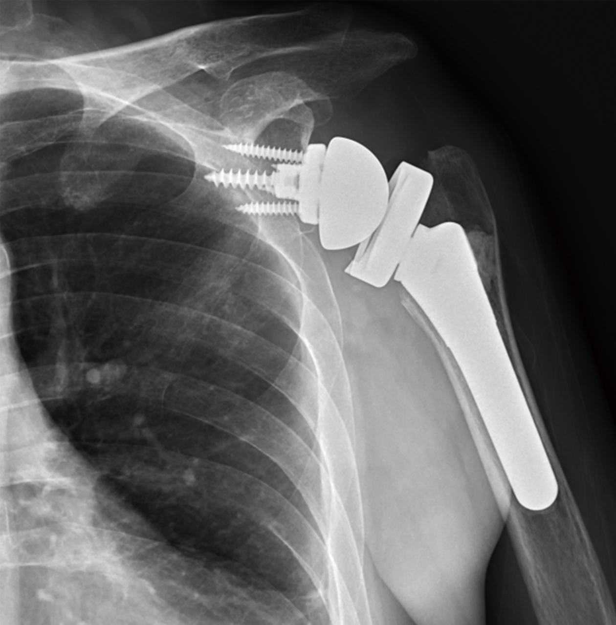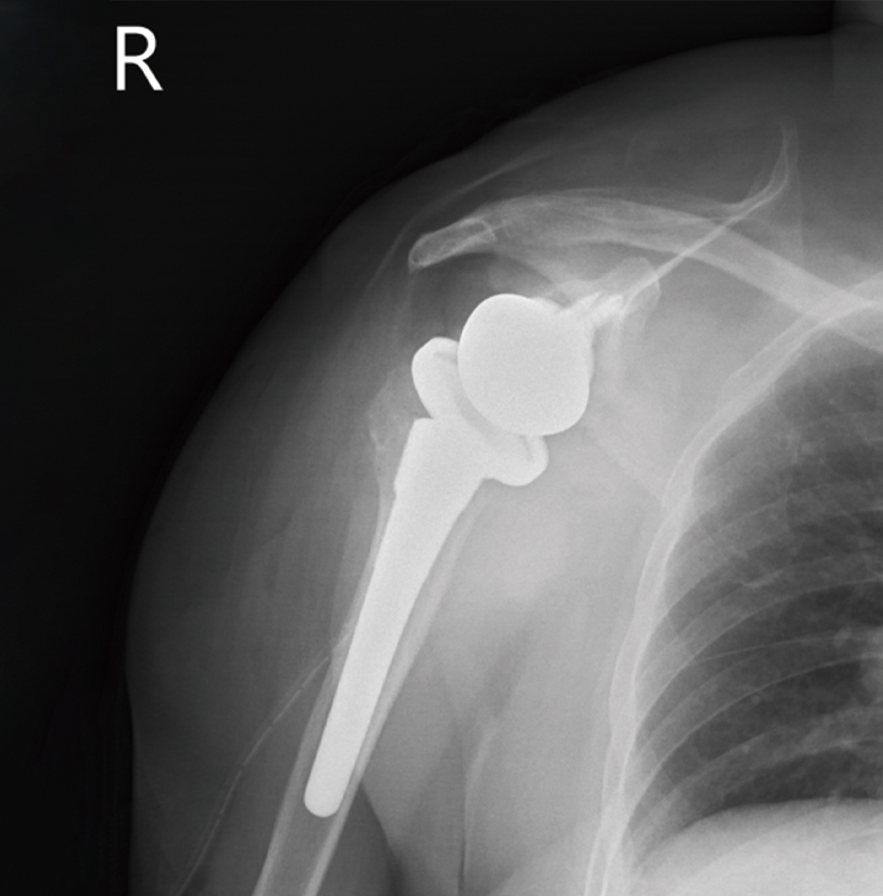 右肩關節炎合併旋轉肌腱斷裂,經反置式人工全肩關節置換手術治療。
