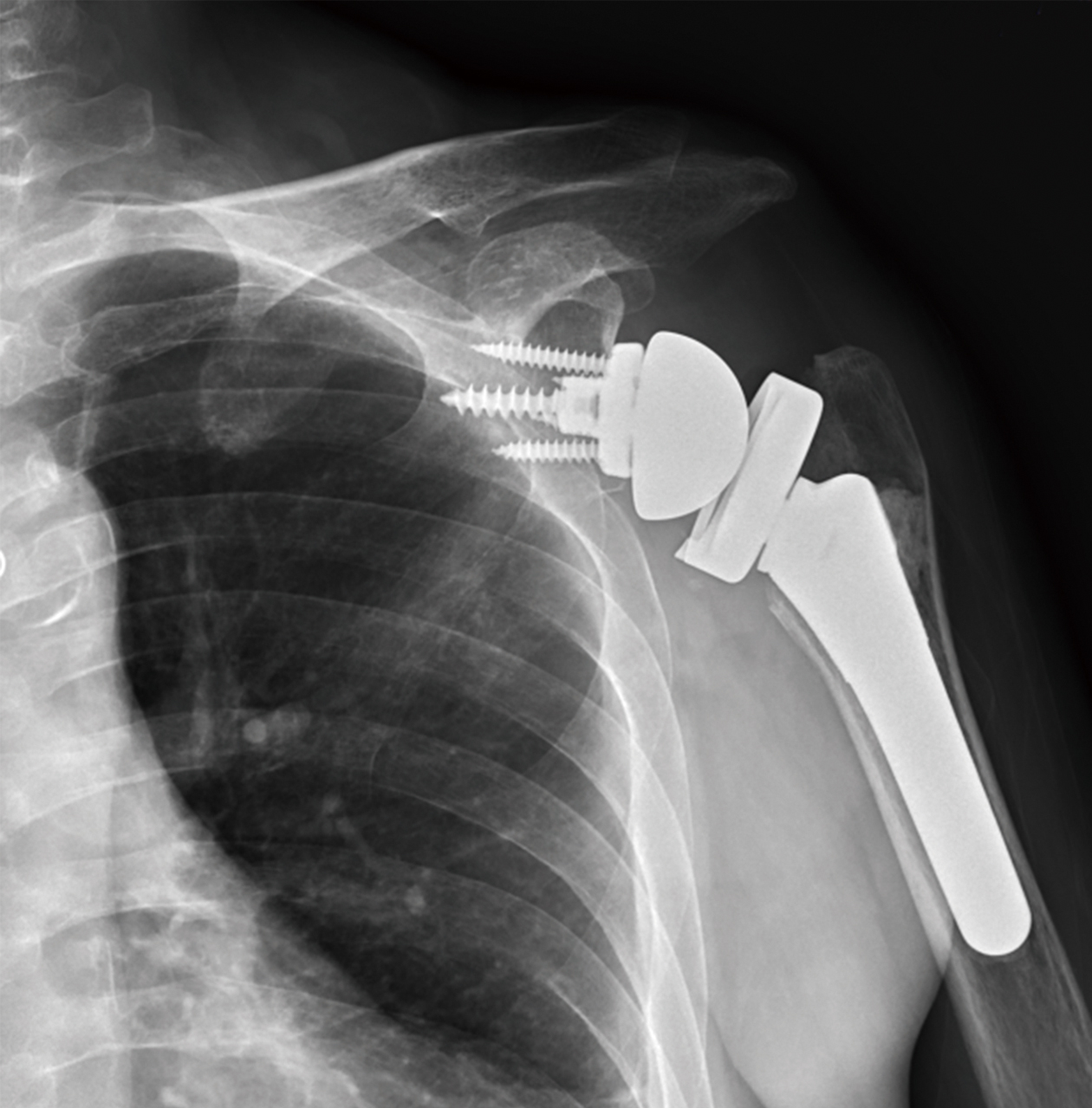 左側肱骨頭缺血性壞死續發關節炎併旋轉肌腱斷裂,經反置式人工全肩關節置換手術治療。