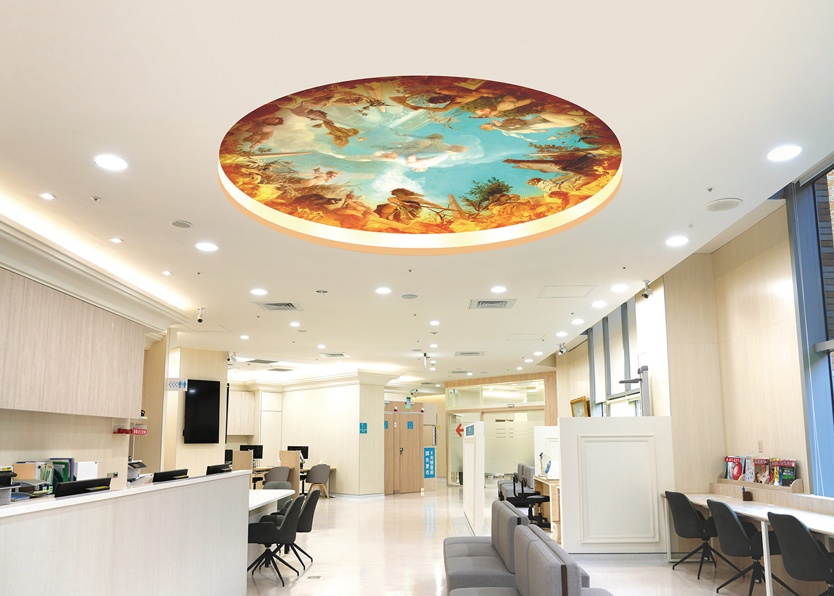 「健康檢查一下子,守護家人一輩子」,2021年12月健康管理中心本著強化健康檢查服務與您一同邁向健康之路的理念在地下一樓隆重登場,改建過程中把裝潢的風格定調為博物館風,入口的羅馬柱及天花板上「音樂的寓意」就讓人有如進入博物館的感覺,很多健檢的民眾對於健康管理中心的整體環境都感到非常滿意,也讓檢查的緊張情緒放鬆不少。