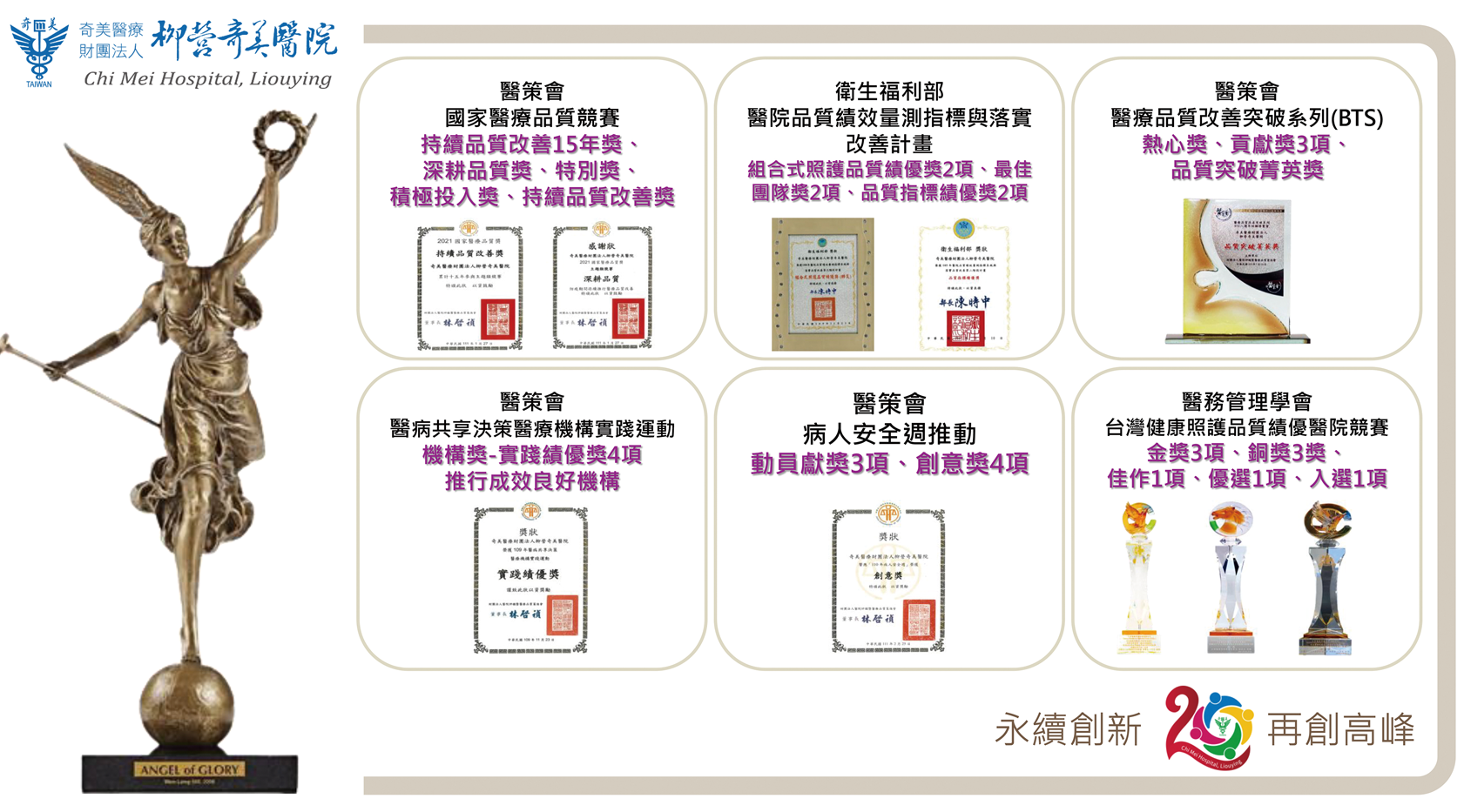 回顧柳營奇美醫院開院20週年以來,屢獲政府機關及各學協會的肯定,榮獲眾多醫療品質提升活動之獎項,包括:生策會SNQ國家品質標章認證12項、醫策會冠狀動脈疾病照護疾病品質認證、國家品質獎獲獎54項、醫病共享決策SDM推動成果獲獎10項及37項機構品質獎等豐碩成果。112年3月新聞週刊(Newsweek)與全球數據公司Statista宣布「2023年全球最佳醫院」(World's Best Hospitals 2023)排名中,柳營奇美醫院更被選為亞洲最佳醫院之一,名列台灣第23名(台灣共35家醫院上榜)之殊榮。