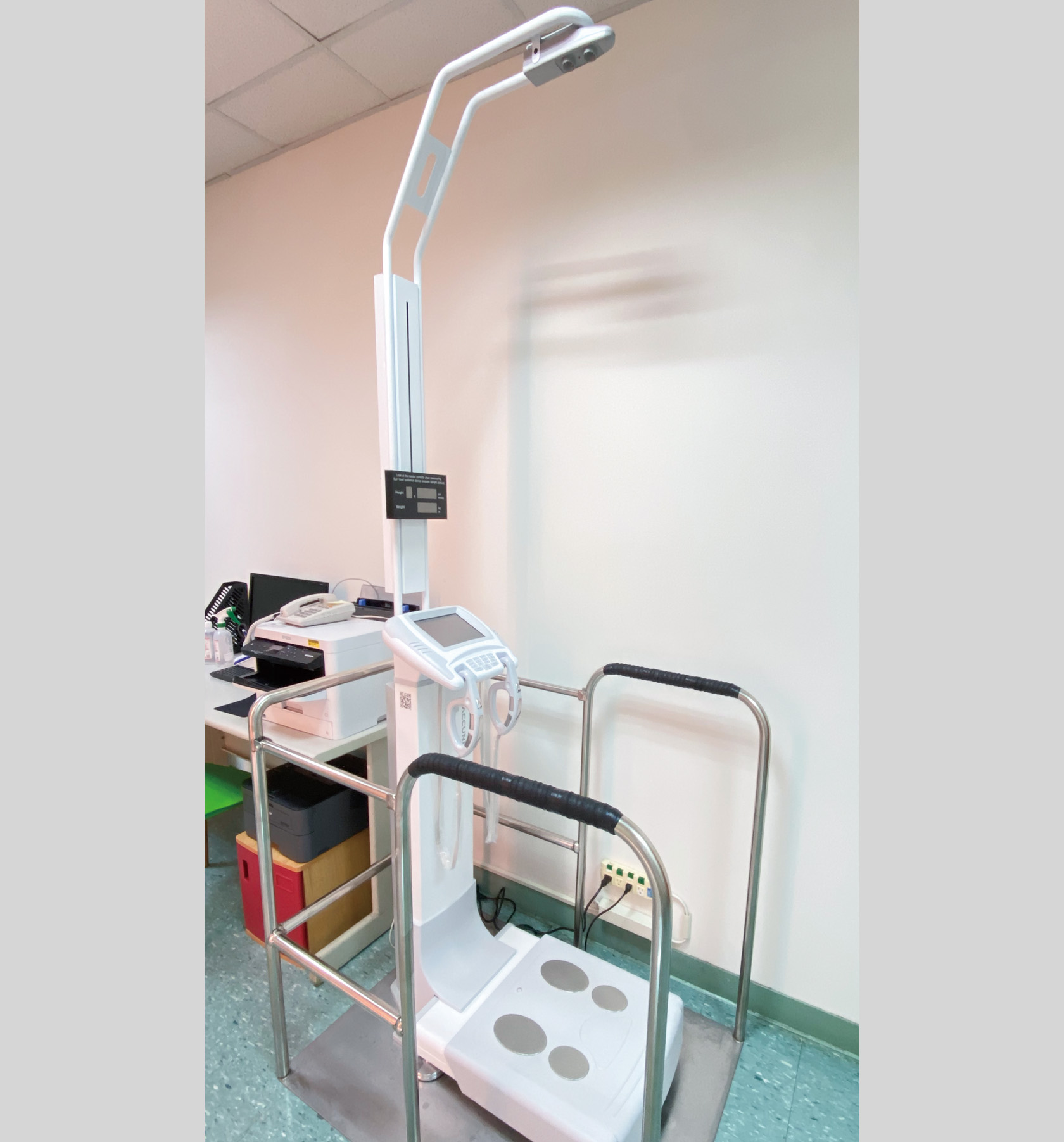 本院購買雙能量X射線吸收儀(dual energy x-ray absorptiometry, DXA),進行肌肉量的量測,即可測得四肢骨骼肌量,再除以身高平方,此方法在流行病學上被多數研究者採用並依循使用。另外也購買了中文獻引用過的ACCUNIQ BC720身體組成分析儀,與DXA有良好的一致性,共有6頻分析,可細節量測四肢、軀幹的脂肪及肌肉重量、水腫分析及相位角,為民眾提升更簡易且實惠的另一選擇,目前仍建議以DXA或是經MRI驗證過之BIA公式進行骨骼肌量之推估。