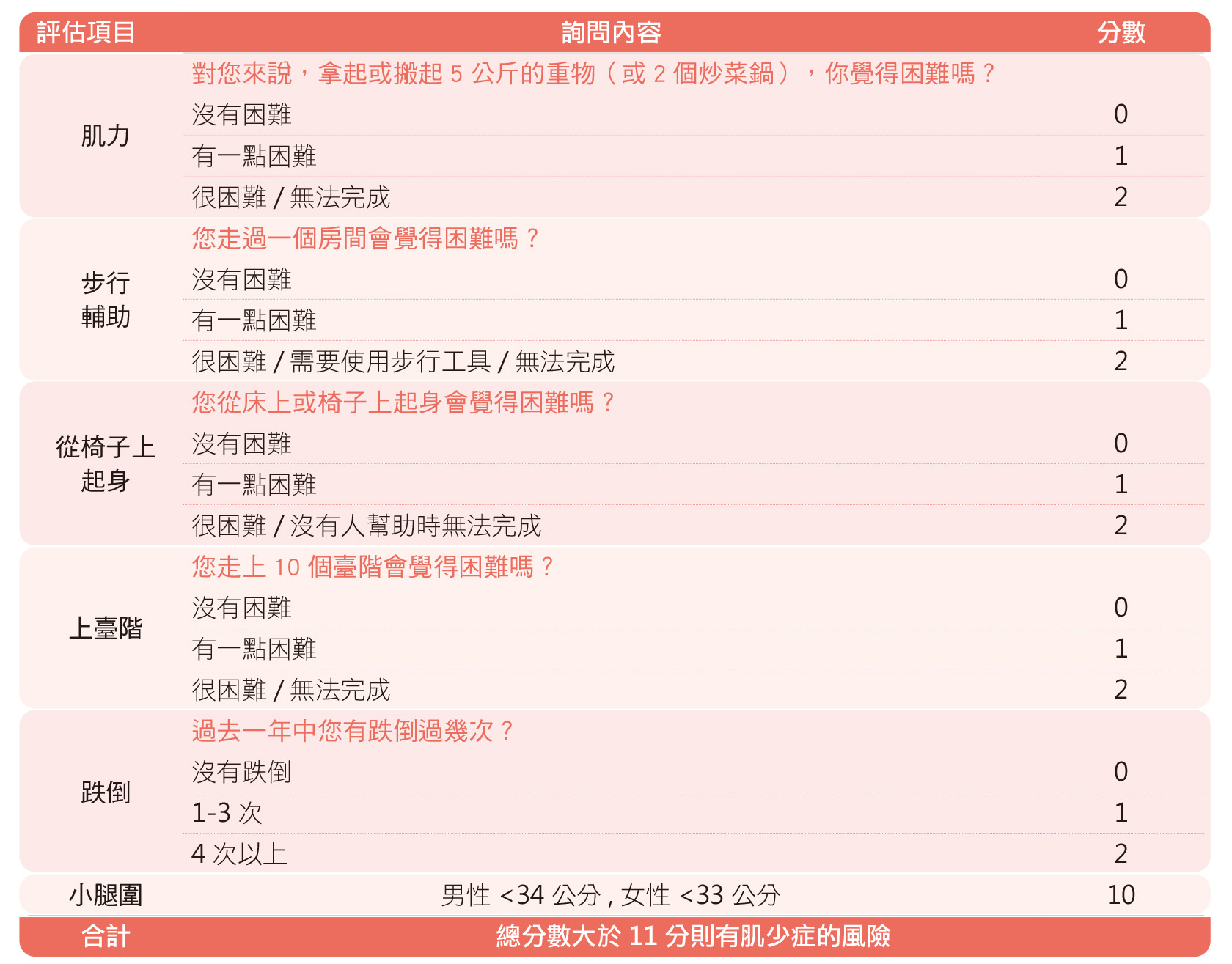 若您平日也想知道自己是否有肌少症的風險,可以利用SARC-F問卷自我檢測一下,它亦可有效預測肌少症所造成的不良預後,加上小腿圍的量測更增加了肌少症預測的敏感度,若總分數大於11分則有肌少症的風險(SARC-CalF問卷,如表一) 。