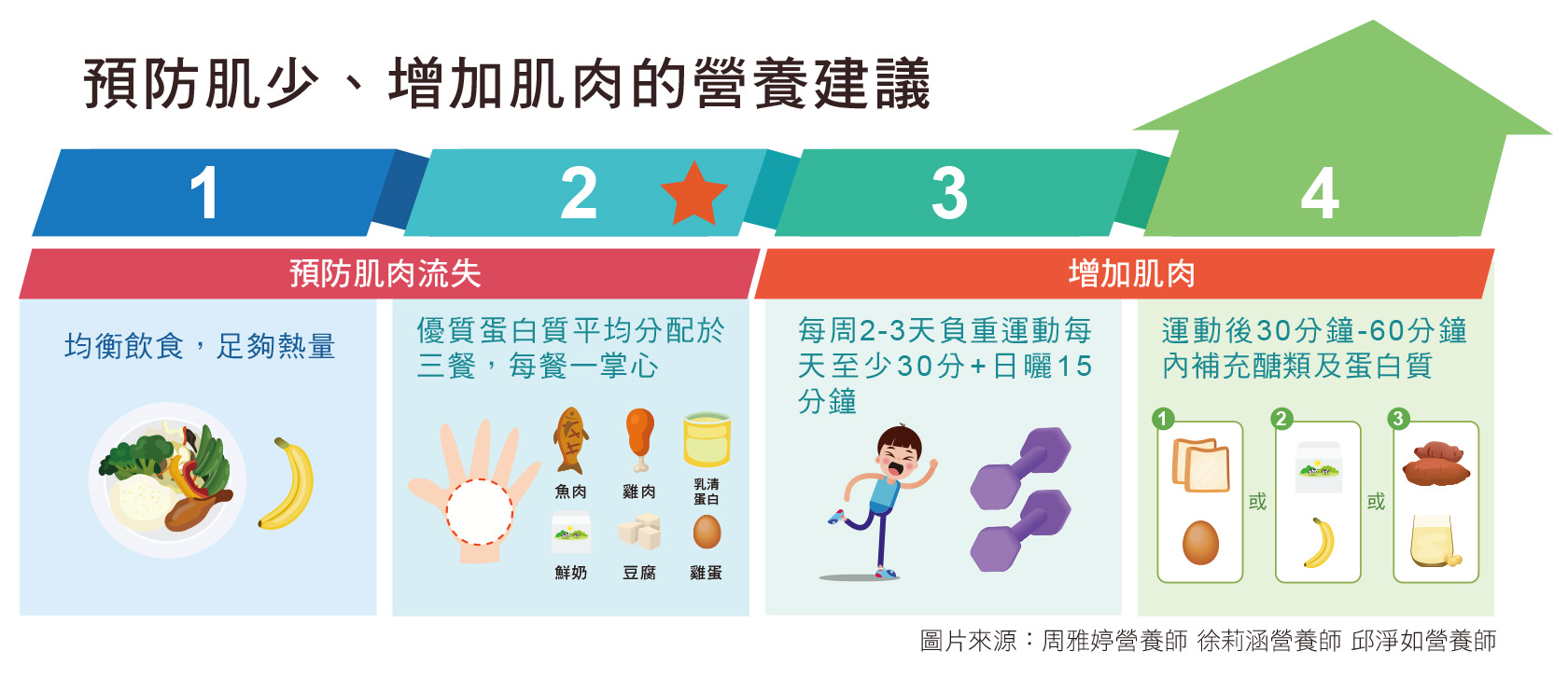 預防肌肉流失:以均衡飲食搭配足夠熱量,其中必須具備優質蛋白質的元素,最好蛋白質平均分配於三餐,每餐以一掌心的量為原則。