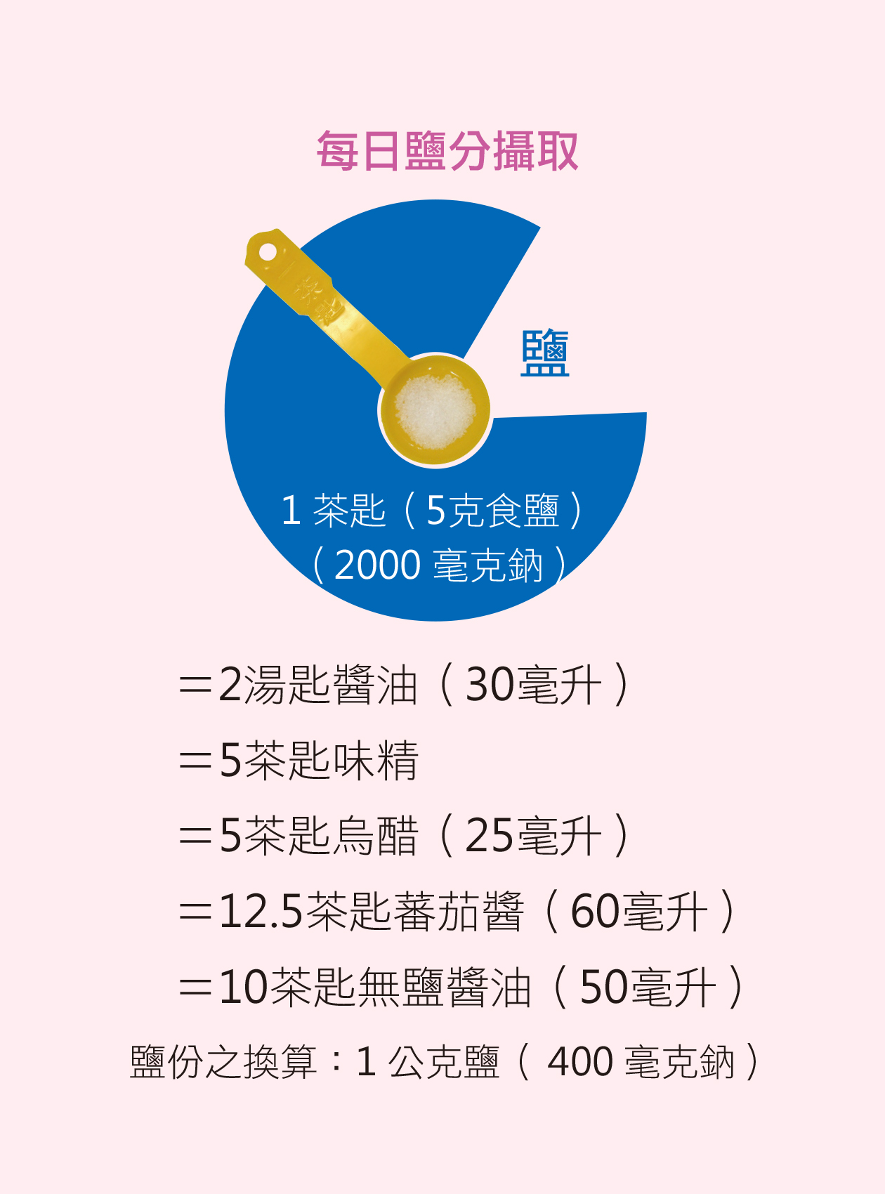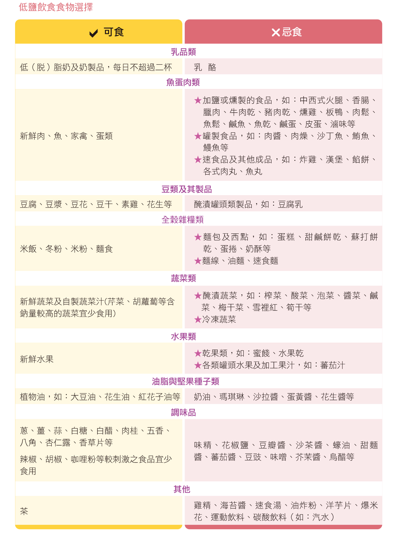 如有高血壓或高血脂等慢性共病,除了以上建議之外,還須注意鹽分和選擇好的油脂。每日鹽分攝取量應小於5克(約1茶匙),也必需減少烏醋、蕃茄醬等高鈉醬料,建議可加入香料如:蒜頭、九層塔、八角、咖哩粉等一起烹調來增加風味。其他食材方面可選擇動物脂肪含量較低的白肉,如:雞肉、魚肉等;選擇植物性料理用油取代豬油,如:葵花油、橄欖油;如果補充堅果種子類,建議一天最多不超過一免洗湯匙的份量,避免吃得太開心反而攝取過多油脂。