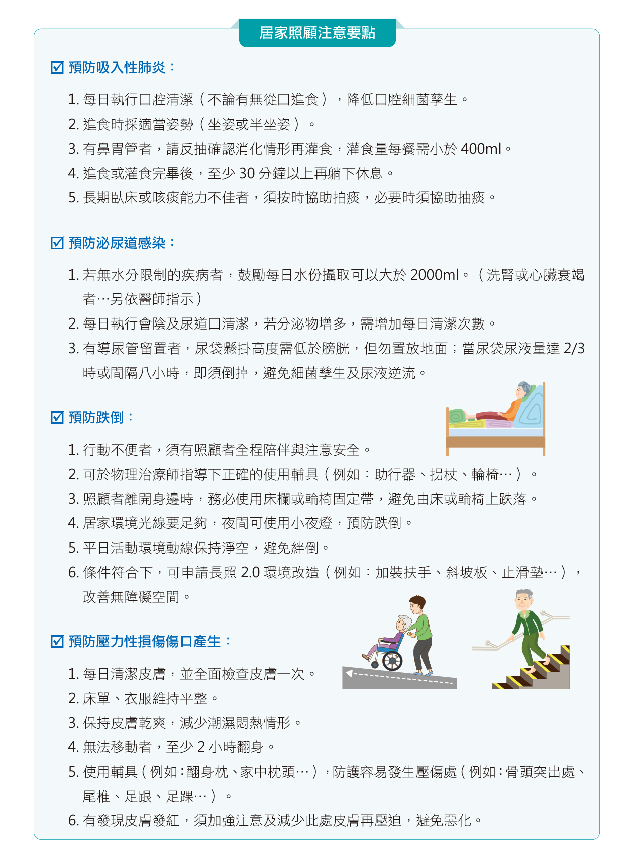 若沒有好好正視這些問題,並給予對應的照護措施,則容易產生我們所不樂見的合併症,例如:嗆食導致吸入性肺炎、飲水不足或身體清潔不佳導致泌尿道感染、下肢無力及平衡感下降導致跌倒、行動不便的久坐或臥床不動導致壓力性損傷傷口(褥瘡)產生…等。
