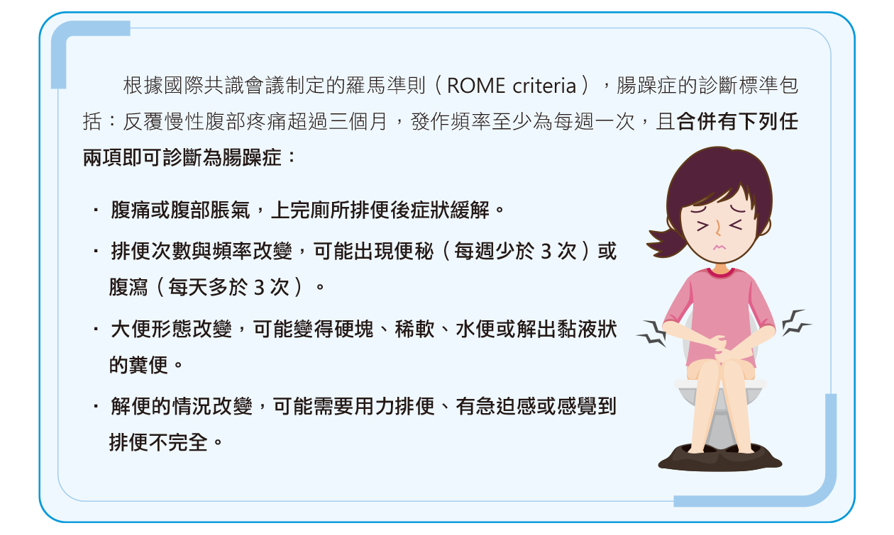 這是我們胃腸科醫師的門診日常之一,現代人生活壓力大、飲食不正常,一緊張忙碌起來,腸胃道就開始作怪了!根據統計,約有一半到腸胃科門診求診的病人是受功能性腸胃道疾病(functional gastrointestinal disorder)所困擾,其中當然也包括:大腸激躁症(腸躁症)。這樣肚子莫名的疼痛、脹氣與不適感很容易造成病人的生活品質不佳、睡眠品質下降,嚴重的病人甚至會跟我說,她根本不敢出門,因為怕一出門就要找廁所。有些病人深受其擾,因為害怕誘發症狀,所以什麼食物都不敢吃。腸躁症被認為是一種腸道功能發生異常的腸胃疾病。這個疾病在臨床上有三個困難:症狀不明確、診斷不容易、治療成效不佳。因此,這些病人很容易淪為醫療遊民,不停地在各間診所與醫院間求助,然而卻很少得到適切的幫忙。