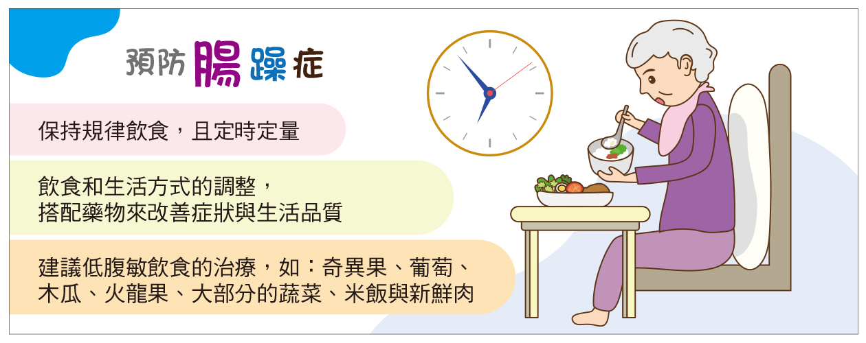 營養與飲食方面,我們會建議病人要保持規律飲食且定時定量。減少攝取高脂、油膩和油炸的食物,這些食物可能導致腸胃不適和腹脹。增加膳食纖維的攝取對於便秘型的大腸激躁症特別有幫助,如多食用高纖維食物,如:青菜、牛蒡和木耳,以促進腸道蠕動。水溶性纖維中的洋車前子(psyllium husk)作為腸躁症的治療方式是有相當好處的。近年來,針對腸躁症病人建議低腹敏(FODMAP)飲食的治療策略方興未艾。腹敏食物(FODMAP)是指一群「容易在腸道發酵的短鏈碳水化合物」,這些成分富含於各種堅果、水果、豆類與人工甜味劑中。這一群特殊的碳水化合物在腸道無法被消化或被吸收,滯留在腸道後會容易發酵產氣或是會造成過多的水分移動到腸道中,造成脹氣、腹痛、腹瀉、痙孿等症狀。常見的高腹敏食物,包括:蘋果、香蕉、西瓜、花椰菜、豆類、洋蔥、大蒜、小麥製品等等。而低腹敏食物推薦:奇異果、葡萄、木瓜、火龍果、大部分的蔬菜、米飯與新鮮肉類等等。