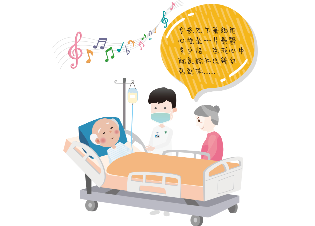 65歲的阿勇因為胰臟癌末期疼痛難捱入住安寧病房,雖然接受常規止痛藥,偶仍有腹脹痛的情形,今天阿勇出現疼痛不適,適逢阿勇期待的音樂輔療師來訪,徵詢阿勇可否放一首歌曲給你聽,他眨眼示意,於是音樂輔療師放了阿勇喜歡的「淡水河邊」給他聽,並進行了輕柔、緩慢地按摩撫觸,沒多久阿勇即進入睡眠狀態,並出現打呼聲,太太訝異阿勇的反應,音樂按摩撫觸進行了約10分鐘,阿勇終於能好好地睡了一覺,隔壁床有人的對話聲,也完全沒有影響到阿勇的睡眠。