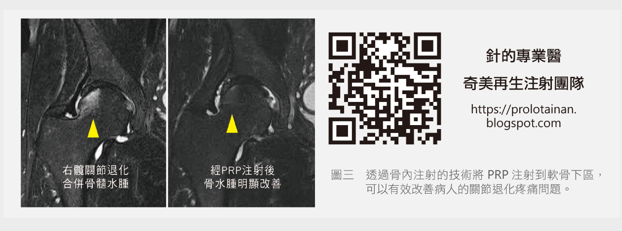 圖三 透過骨內注射的技術將PRP注射到軟骨下區,可以有效改善病人的關節退化疼痛問題