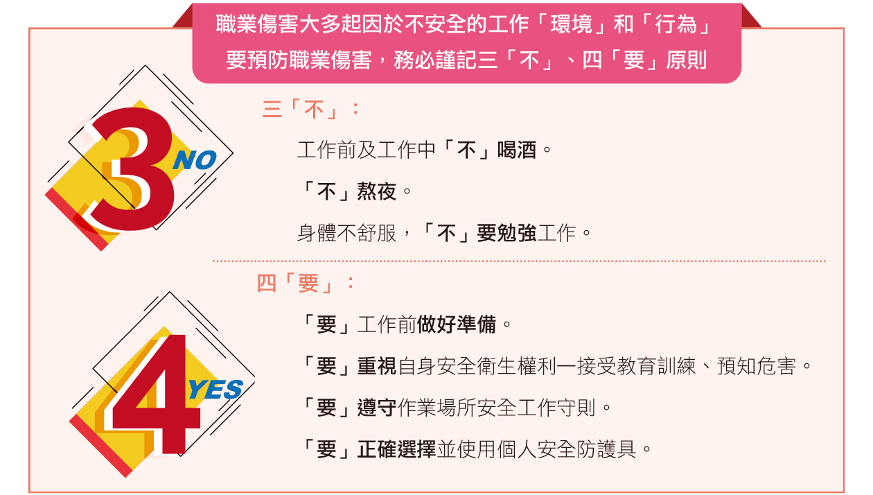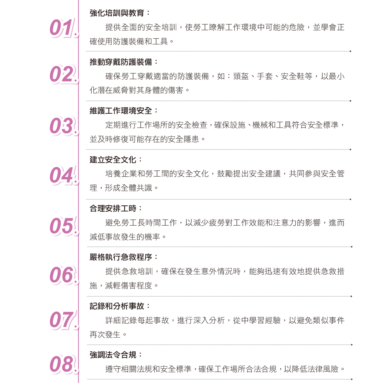 勞工是企業的重要資產,勞工安全更是企業主心中不可輕忽的重中之重,以下建議事項希望可以有效降低勞工職業傷害的風險,同時提升整體工作環境的安全水平。透過全面性的預防措施,不僅能保護勞工的生命安全,還能提高生產力和企業的長期競爭力,敬請各位企業主參酌: