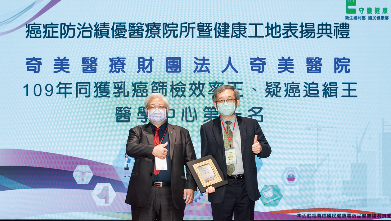 奇美醫學中心更多次獲得來自國家的肯定,分別於108年與109年連續兩年榮獲國民健康署頒發本院為乳癌篩檢效率王醫學中心第一組第一名,以及110年疑癌追緝王三癌醫學中心第一組第一名。