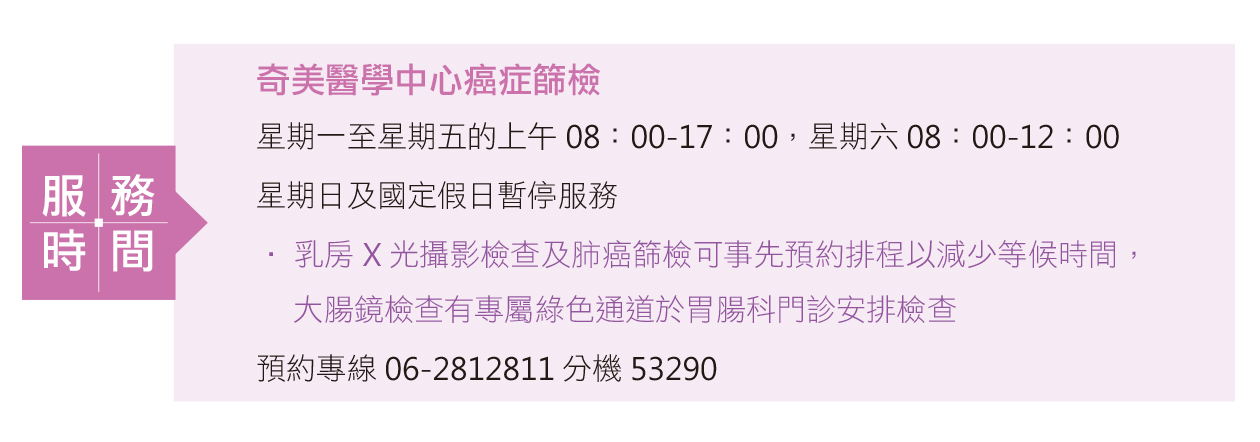 在奇美醫學中心歷年診斷確診為罹癌病人中,我們也發現如果能在符合篩檢條件且未有明顯症狀時定期進行篩檢,其存活率皆高出許多,所以為能加速篩檢陽性個案能夠進行確診,奇美醫學中心提供綠色通道,包括:確診轉診號和保留進行確診的大腸鏡名額,減少民眾等候時間。