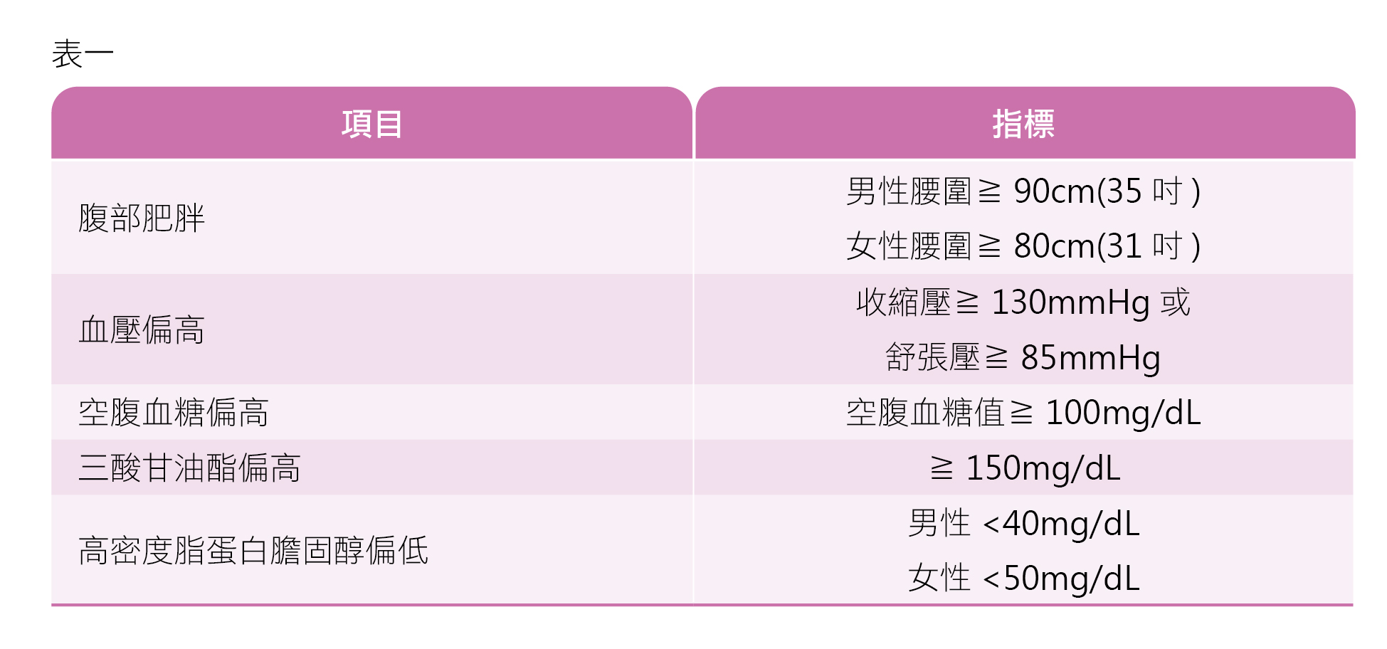 現今生活便利,飲食常見高糖、高熱量及高油脂,忙碌的生活型態造成缺乏運動,體重過重的問題成為許多現代人的隱憂,進而使糖尿病的發生率逐年升高,特別是已符合代謝症候群的民眾需特別注意,往後成為糖尿病的機率是一般人的6倍,那何謂是代謝症候群呢?根據以下五項指標評估若有符合三項(含)以上即可判定為代謝症候群(如:表一)。